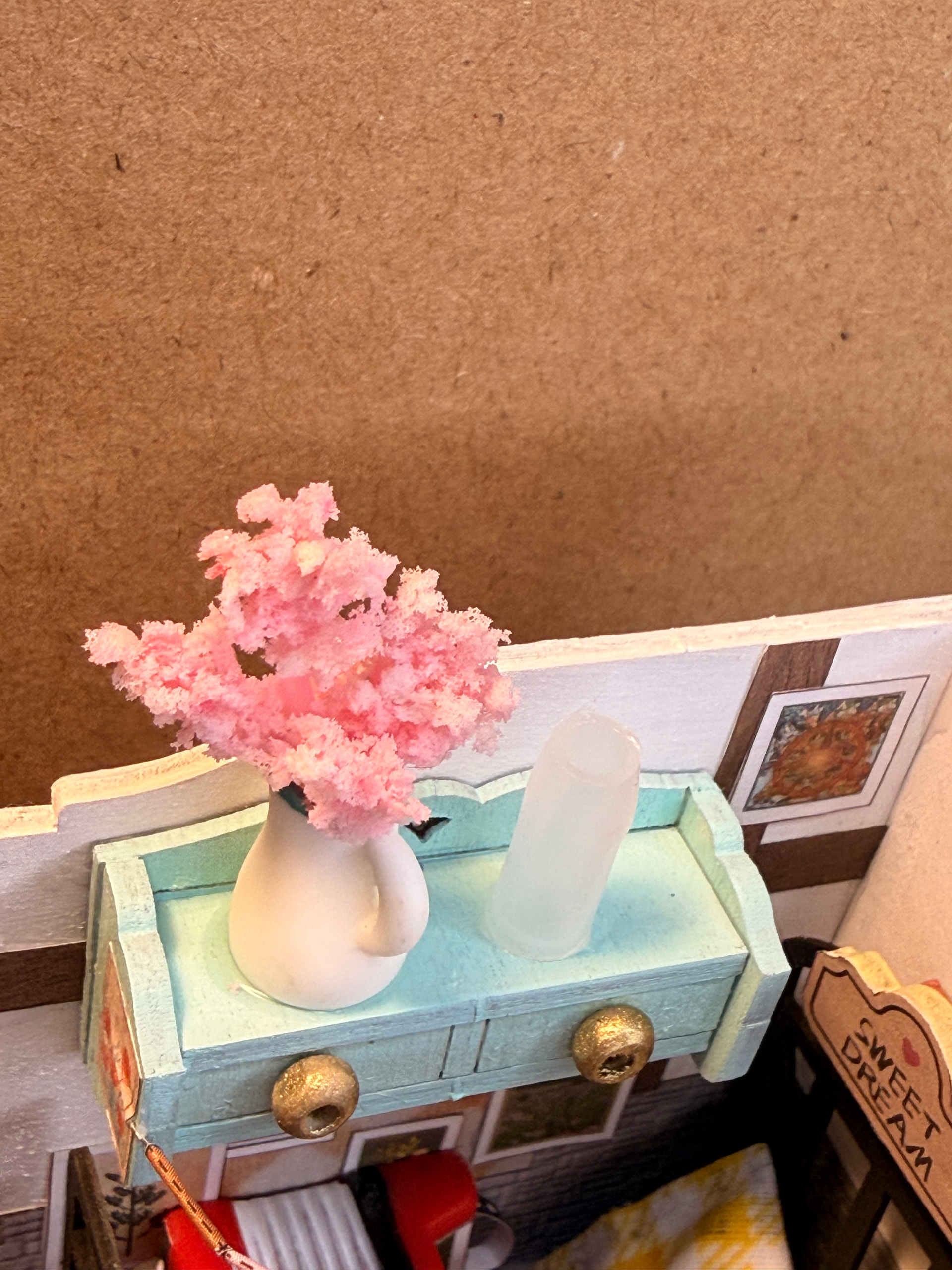 Despite the surprise, it turned out irresistibly cute. I love all the tiny details! The Pink Floral piece inside a vase, the bag, the cute bear…A perfect little dream tucked into my hutch, quietly filling a space and pretending it was always meant to be there.