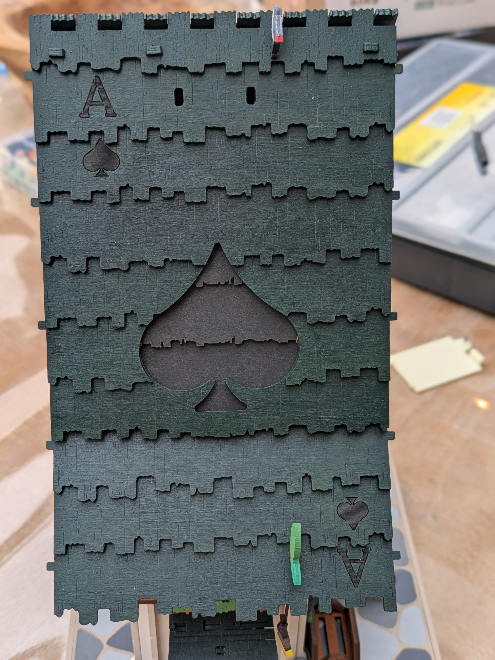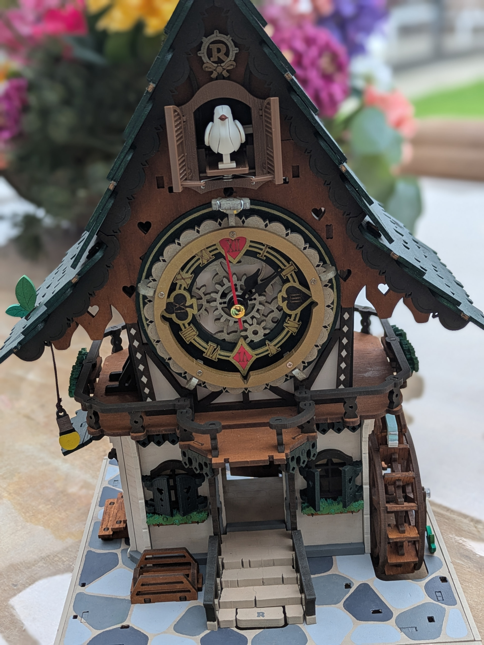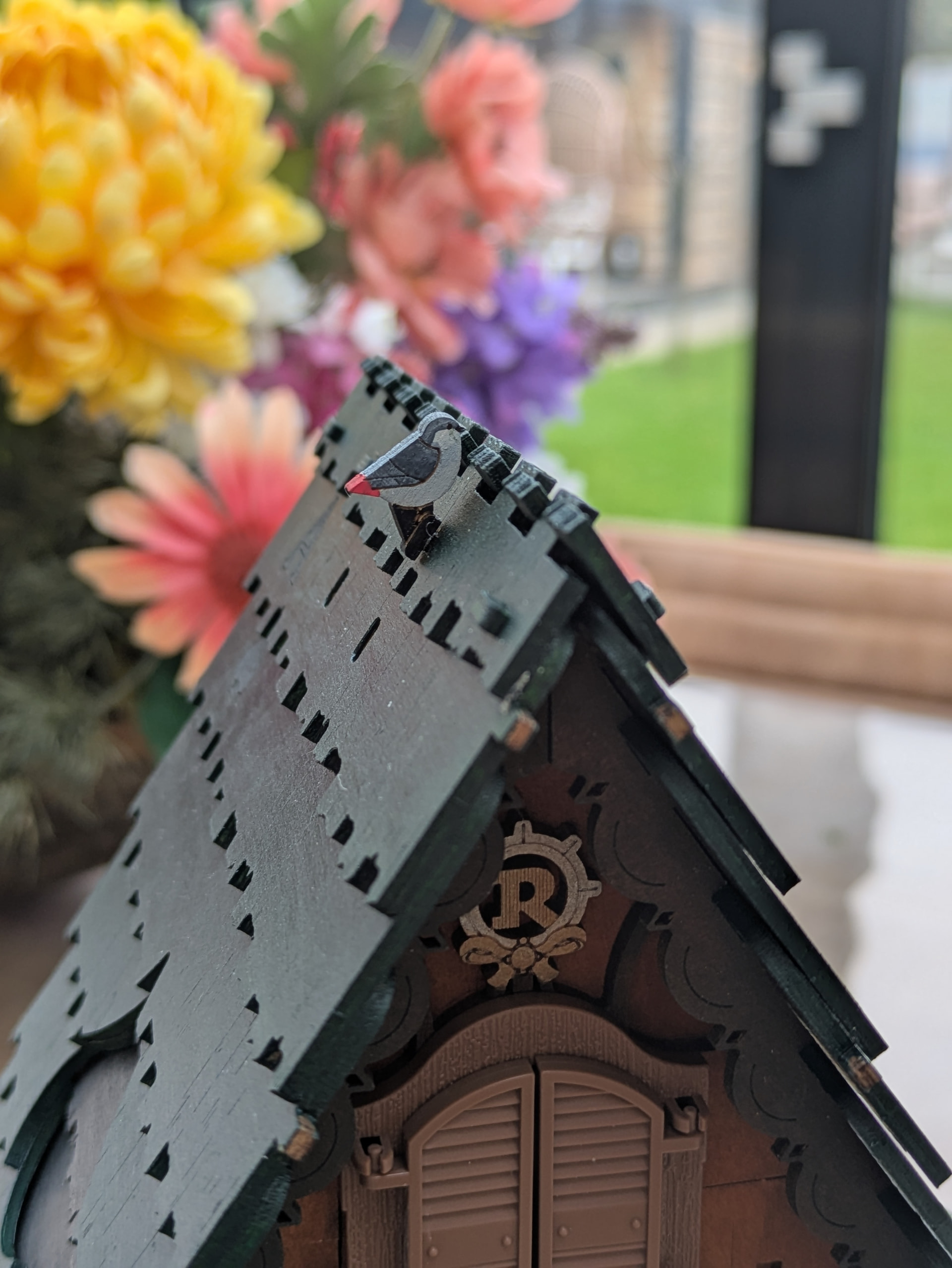 After three evenings of painting, the roof is finally finished. I colored the little bird on the roof in the colors of our parrot, “Rambo.” Just a few more small details to add, and this clock is finished. ![]()