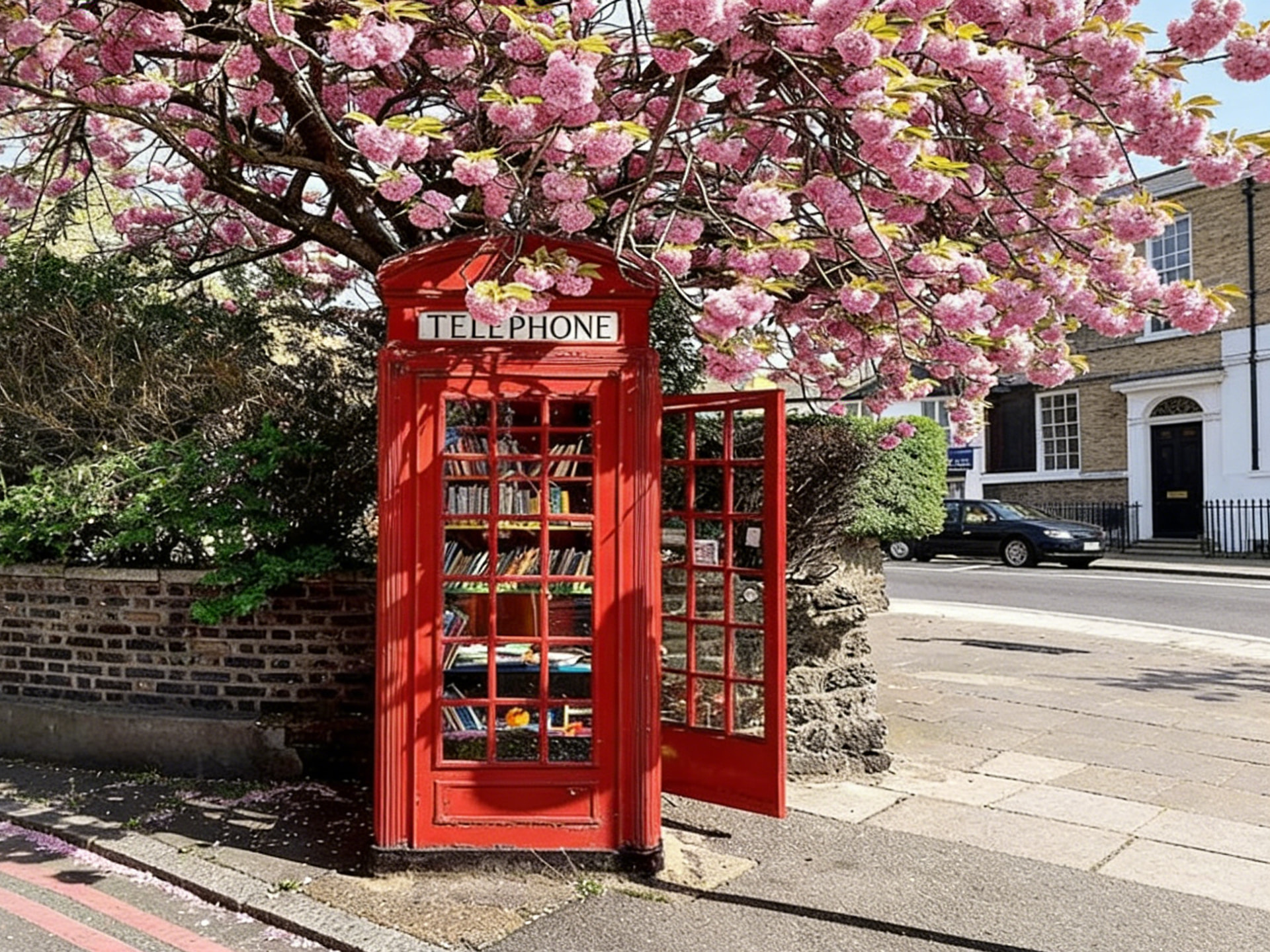 On a radiant spring afternoon, a gentle breeze drifts through a quiet street corner, and floral shadows sway softly across the cobblestones. Somewhere in memory, a classic red London book Booth stands still, holding countless stories of passersby within the folds of time.