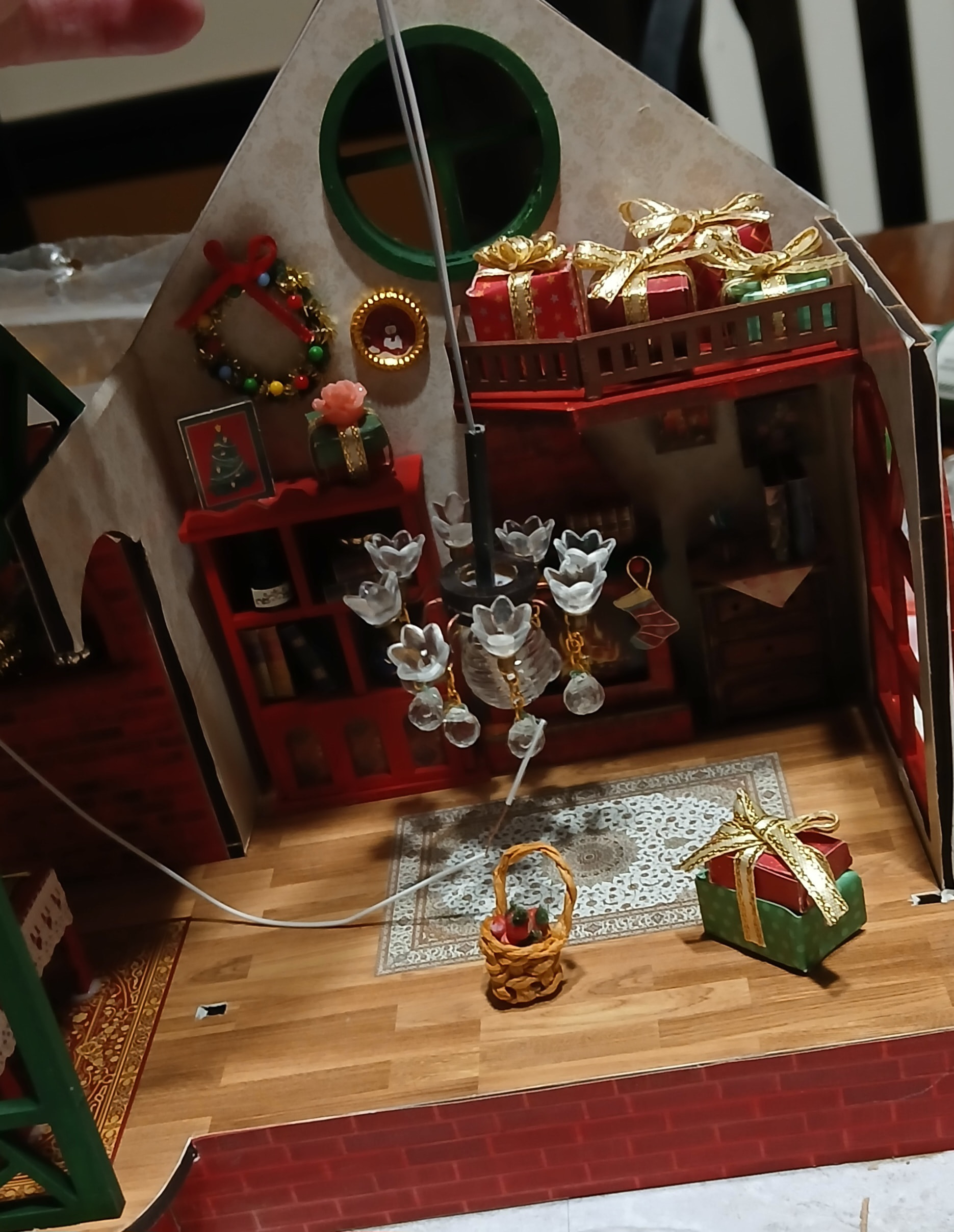 I have finally conquered my Chandelier and that woven basket which have been a pain in the butt. The presents as well. I started on this build 10 days ago. Now that my chandelier is complete, I can start building. The next major hurdle is checking all of the lights. I still expect to spend three more days on this one.