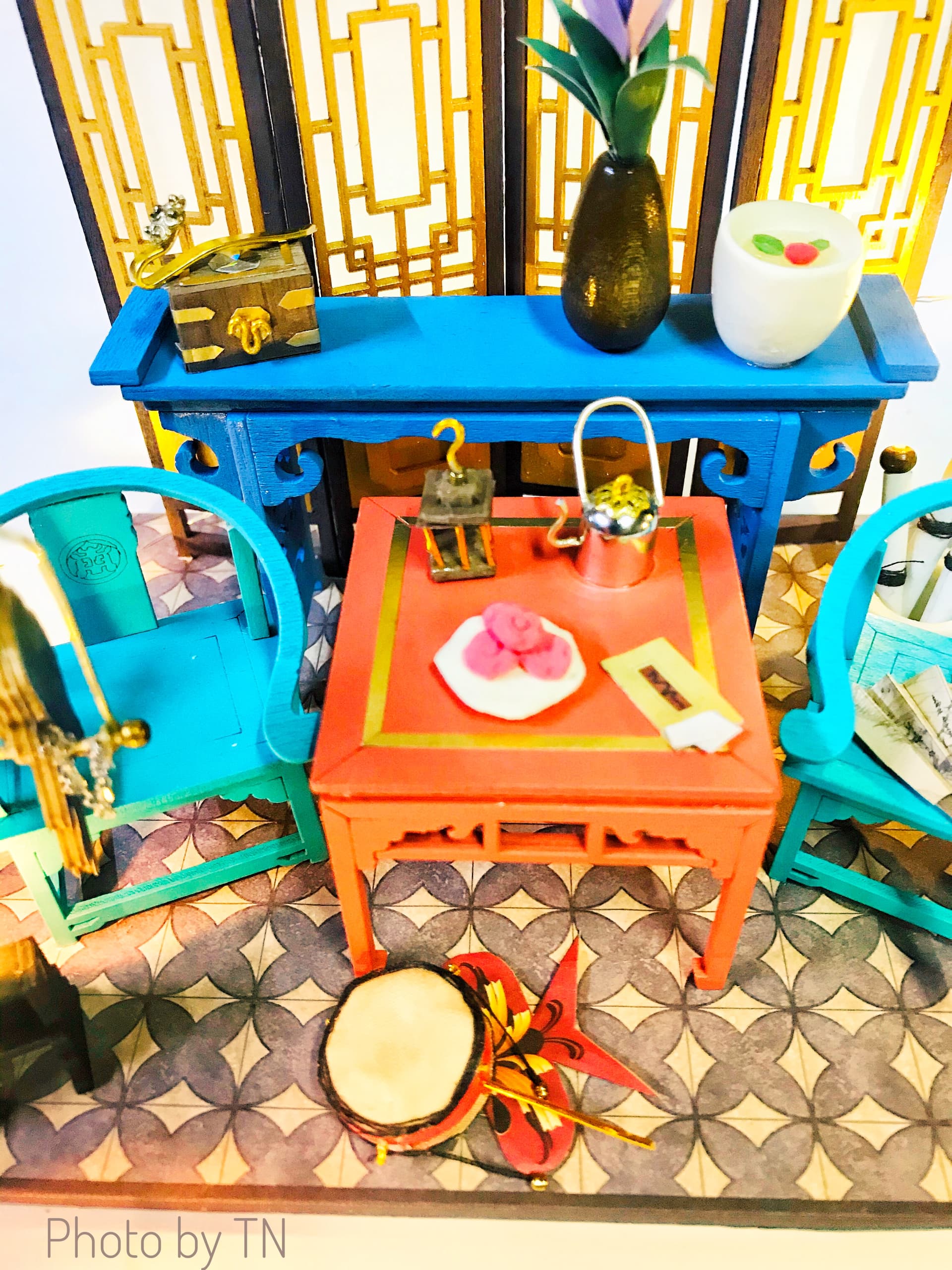 Such a beautiful little intricate set! The fan and the little tea pot are soo cute! And the bird stand is so straight! Amazing work!