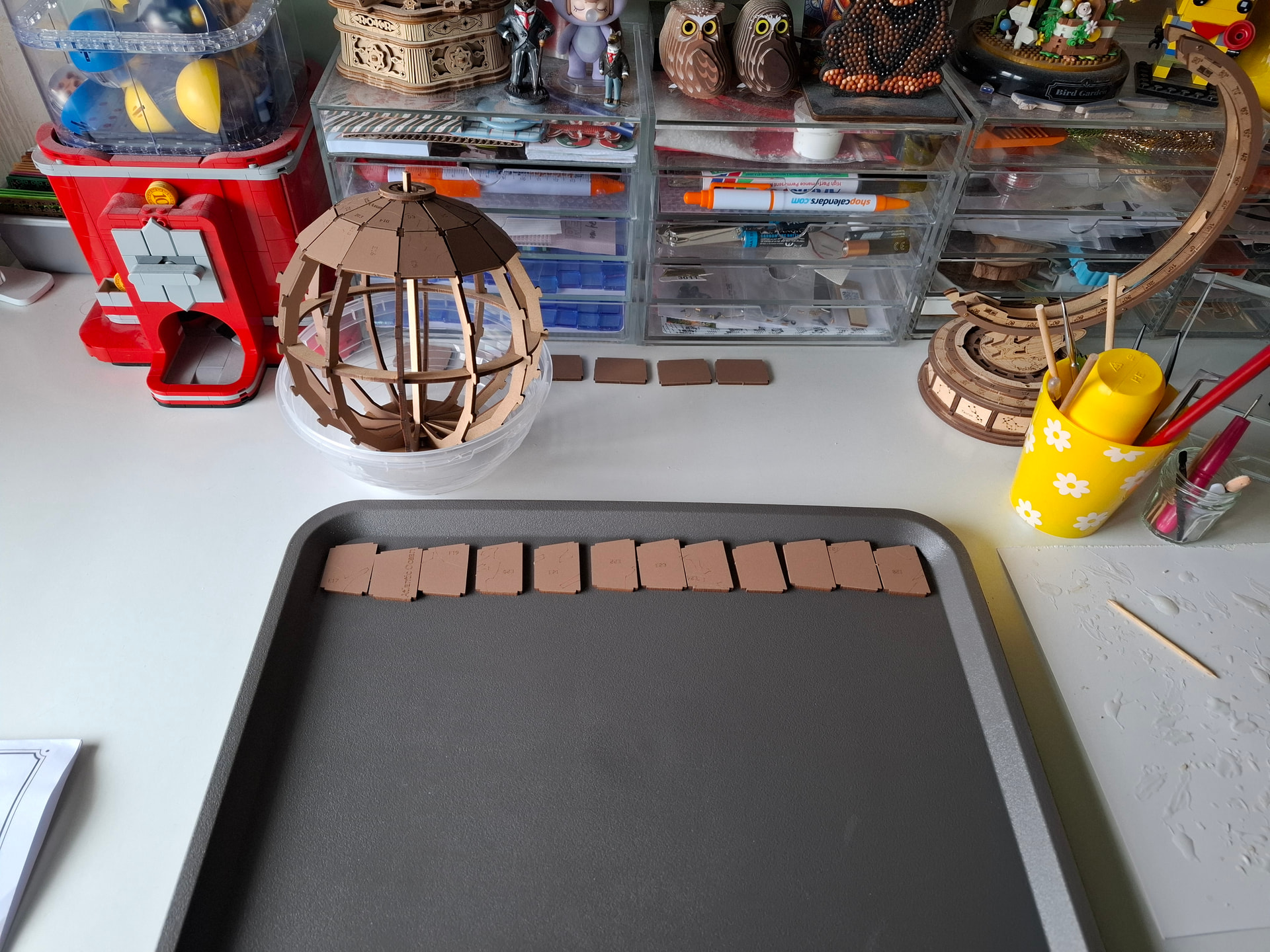 I am over halfway of putting the plates in (only 3 more rows to go), and it’s really focusing on putting them in right so the map is correct, and as I was annoyed with the enormous manual I just did a piece of it thru the copy machine this afternoon so the instructions are not over all my working space, and got a plastic thing putting the globe in so it is steady working on it putting the plates in