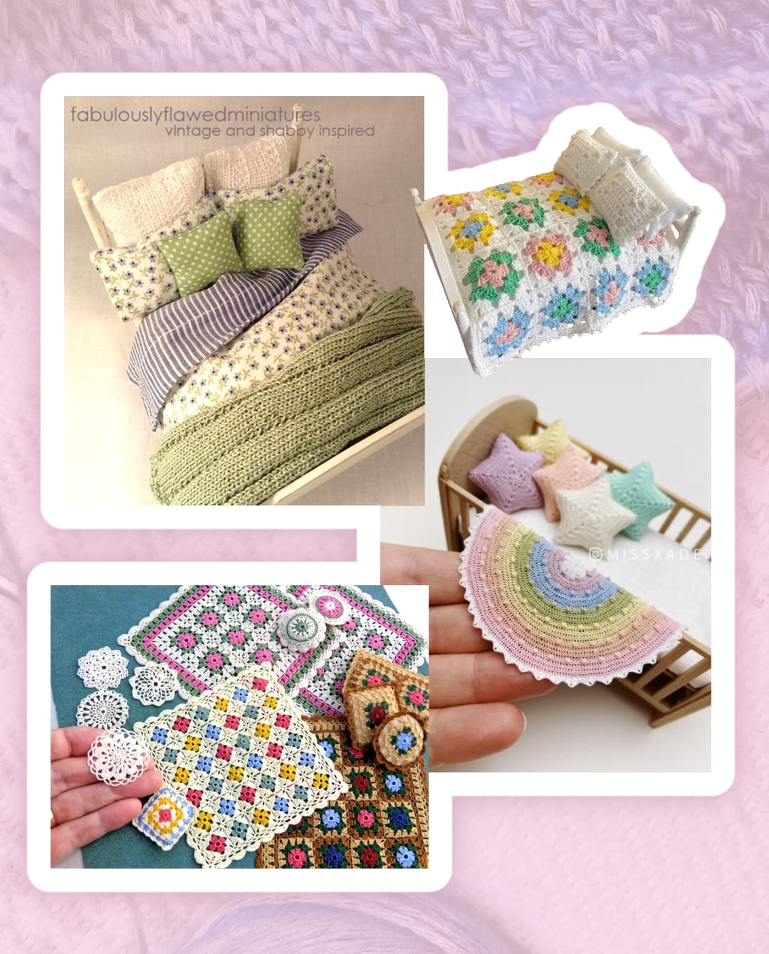 For people with knitting skills, I’ve put together a few ideas for decorating your miniature houses and rooms.