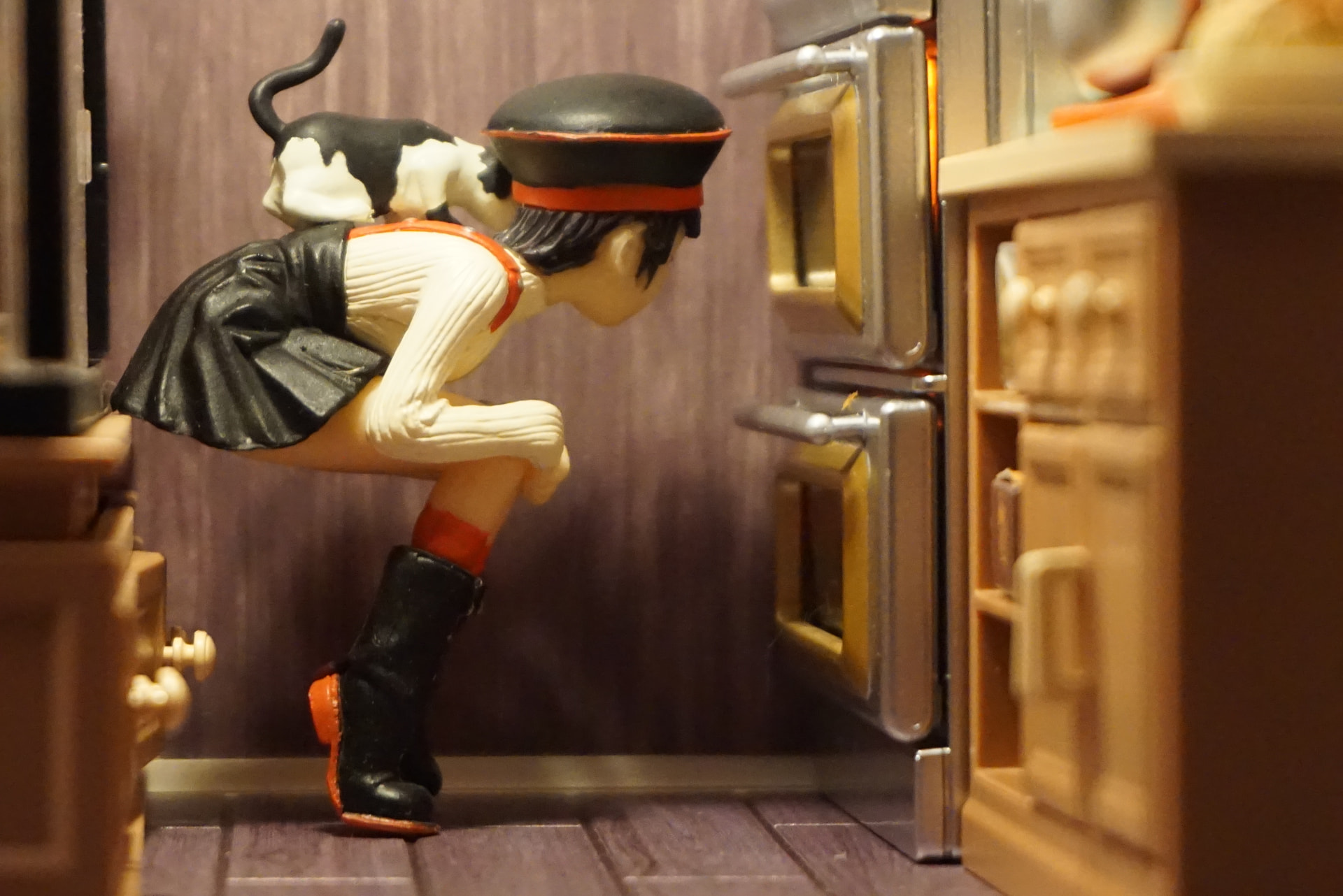 Inlove the photo were she is looking in the oven. She is exactly on the right hight.