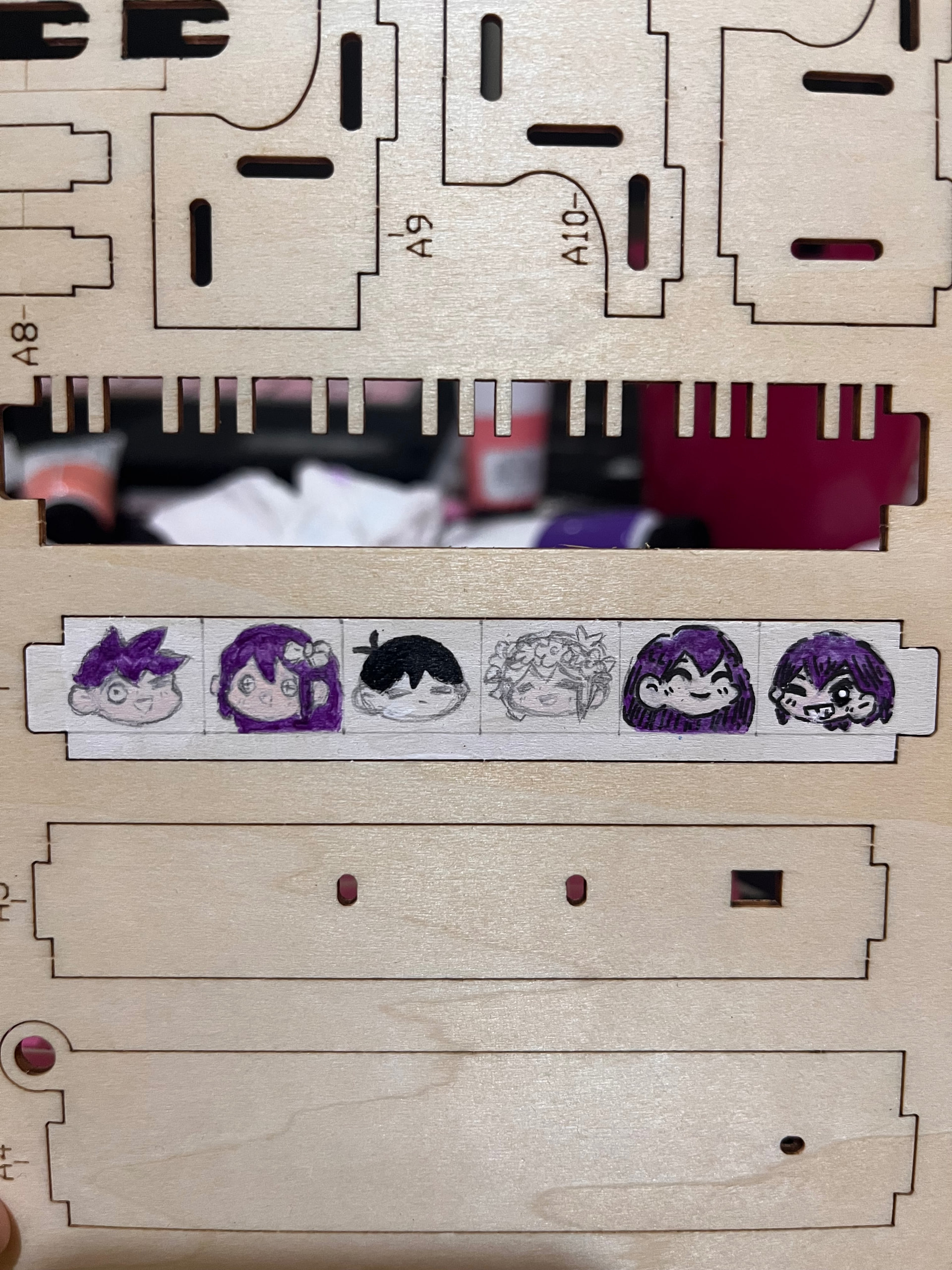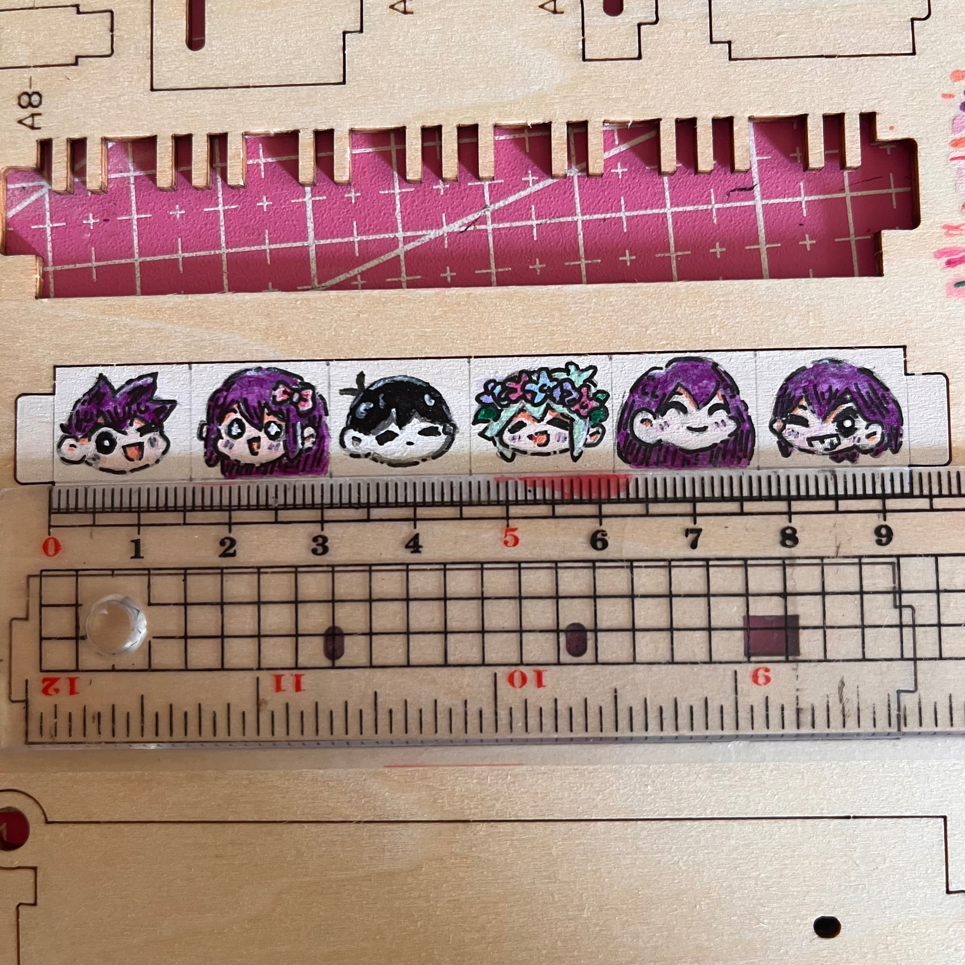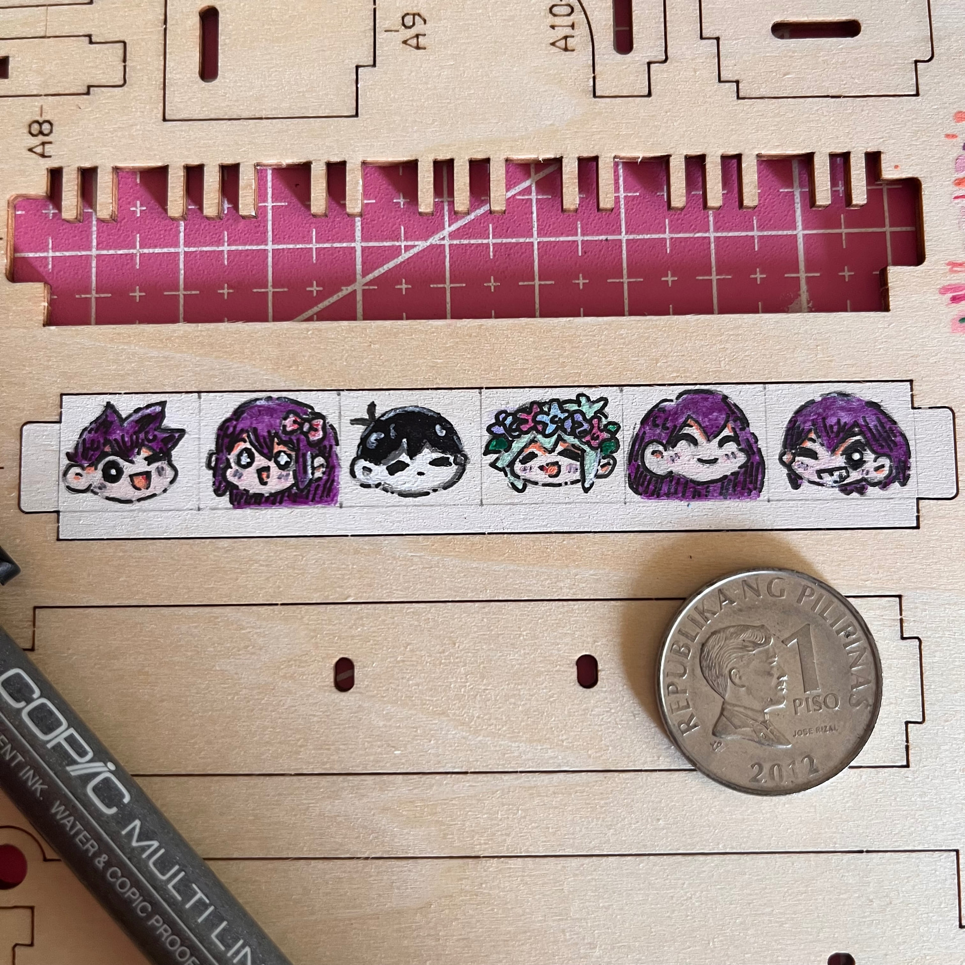 Finally!! I’m done coloring the characters. I was a bit hesitant to color them since it’s my first time to sketch and color such tiny drawings phew. I’m doubtful to myself if I can color them since I used watercolor more than acrylic paints. I’m considering myself as a beginner in using acrylic so I’m really glad that I’ve colored them the way I wanted and imagined. I’ve outlined them using a copic pen. These are some of the process while painting them. I’ve used the wood as my paint palette wahaha.