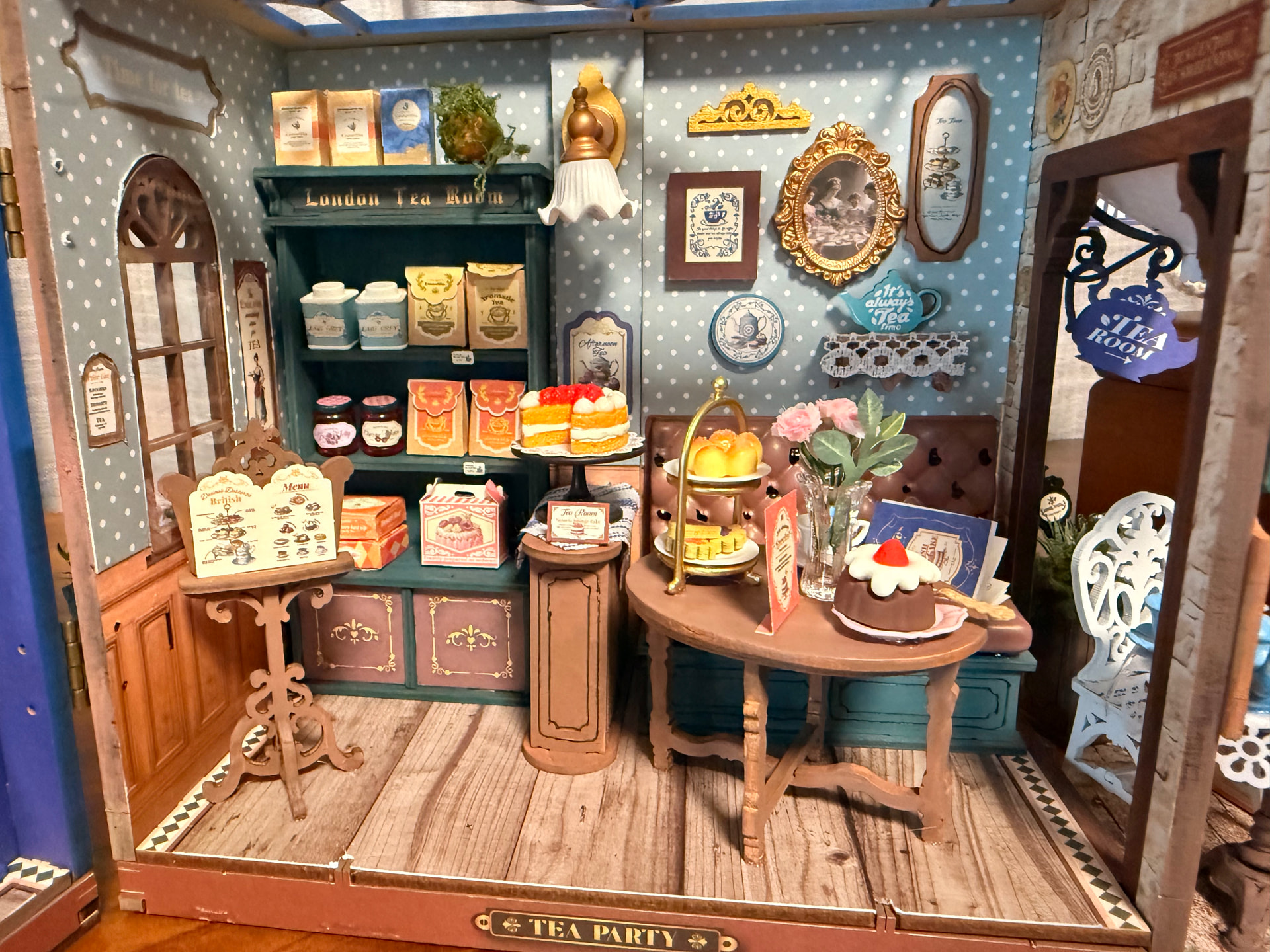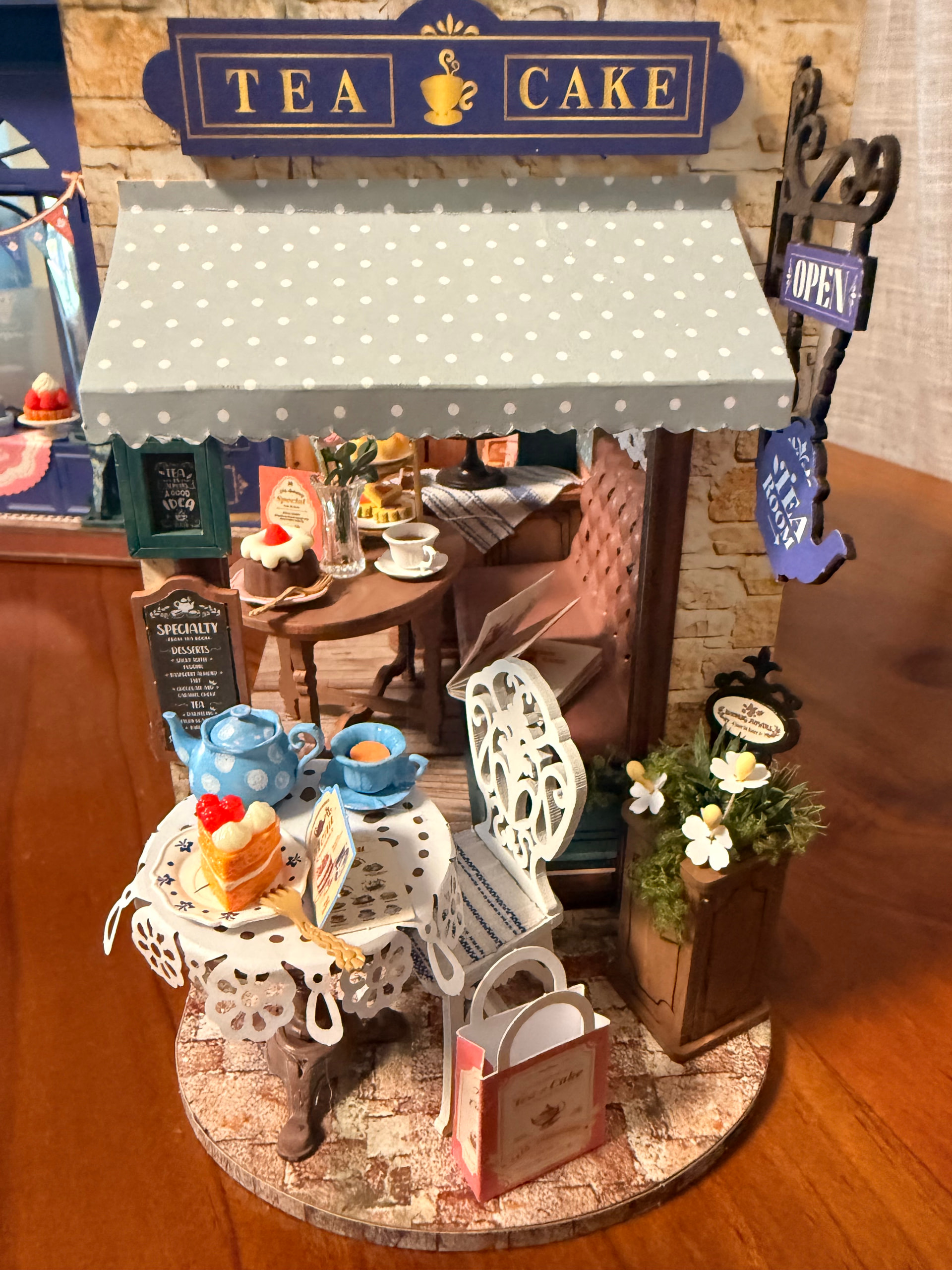 I really wanted to set up the outside table so that it appeared a tired shopper and her dog had stopped in for a tea break but the space was too limited to fit the dog.