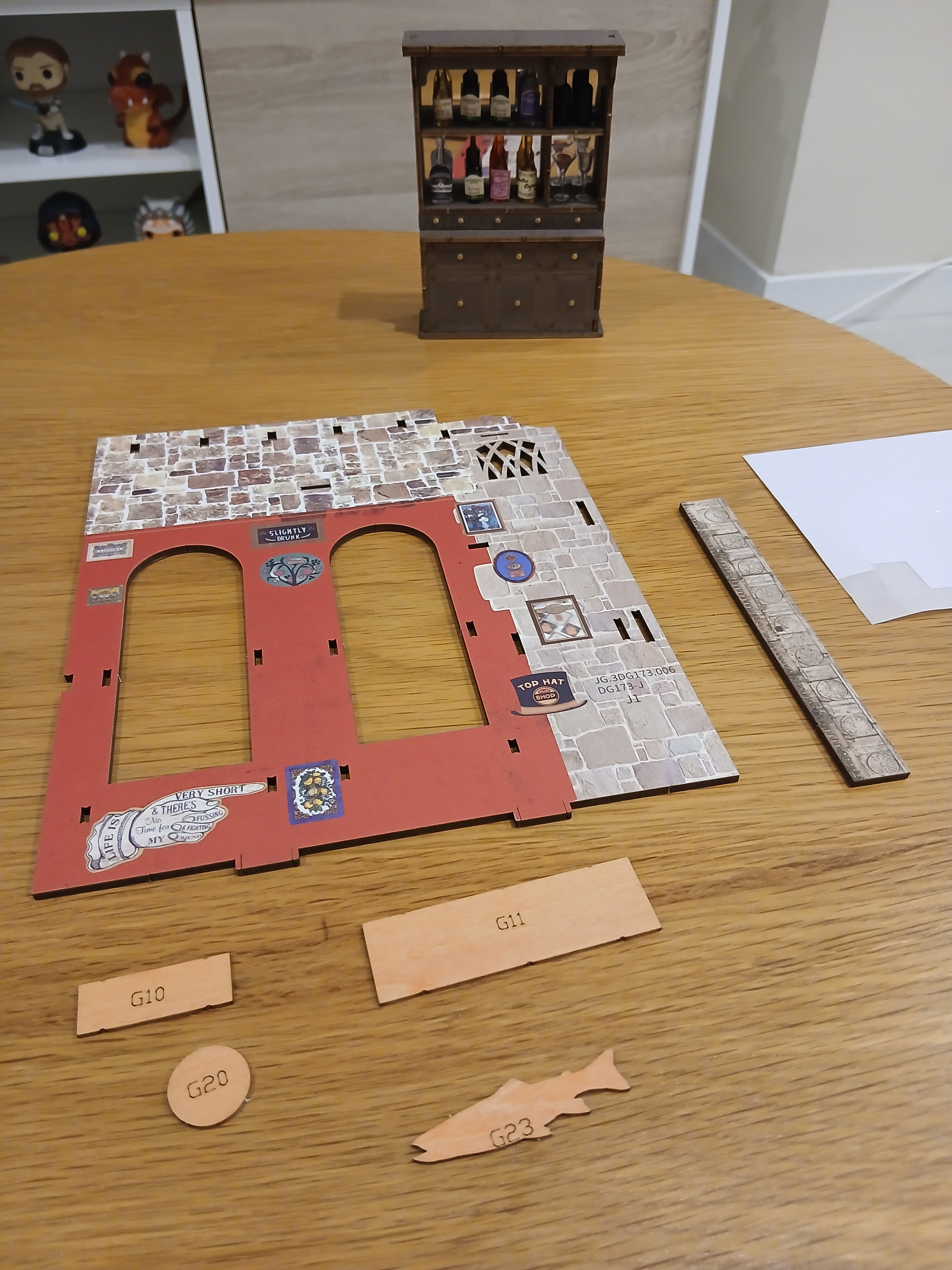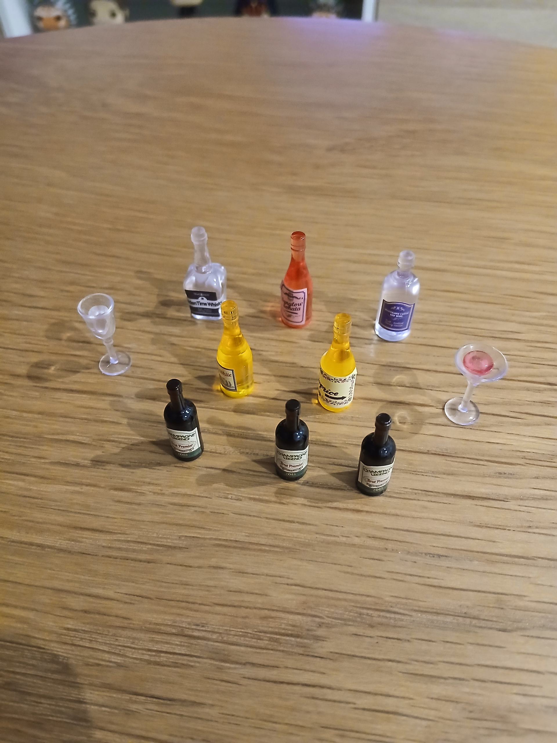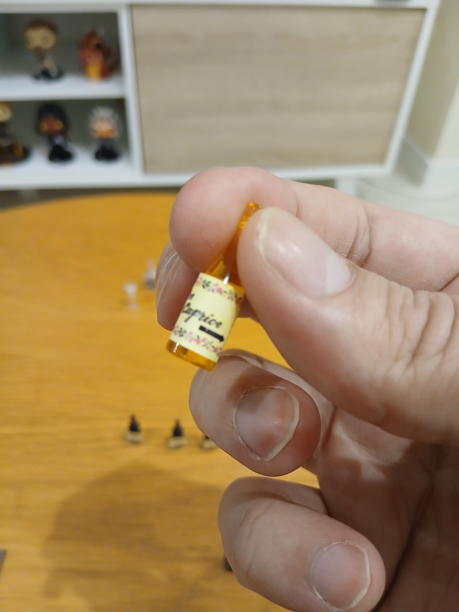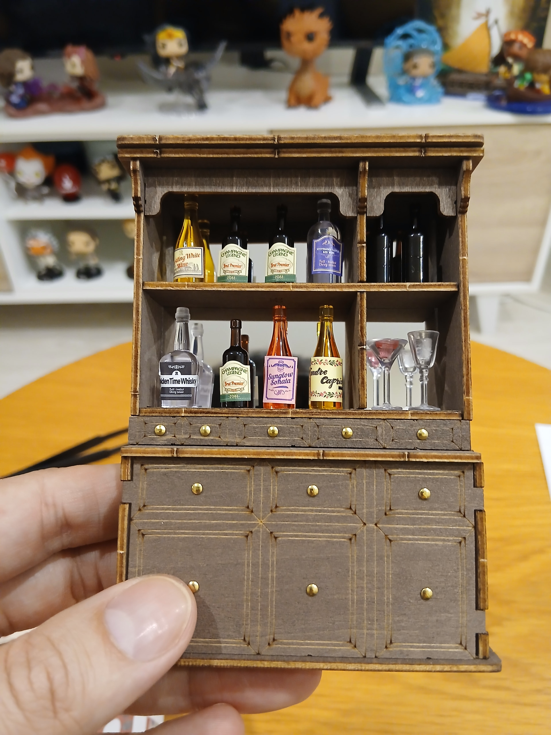 Let’s keep going with this Miniature House first of mine, folks! I was thirsty today, which conveniently translated in the assembly of the wine bottles and cabinet. The tiny cute wine bottles received their convenient stickers…