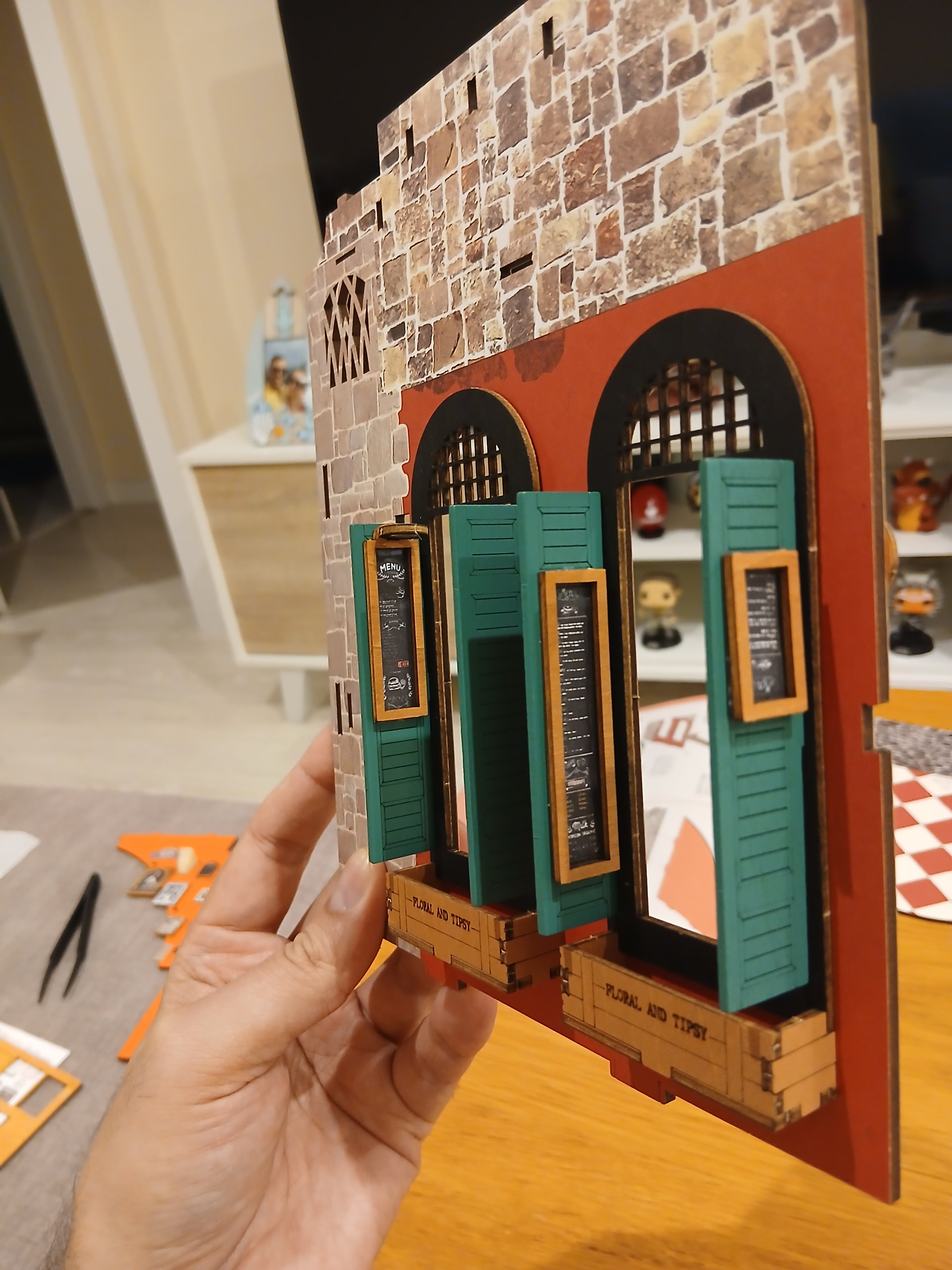 So, finally, I was gonna be using some of the things I’ve been putting together in previous steps! You know, I’ve built some Robotime kits already and I’m still fascinated by the precision and accuracy regarding parts fitting with each other. Everything is just soooo well thought and smart! And just like that, a few minutes later, the first wall is finished and looking AMAZING.