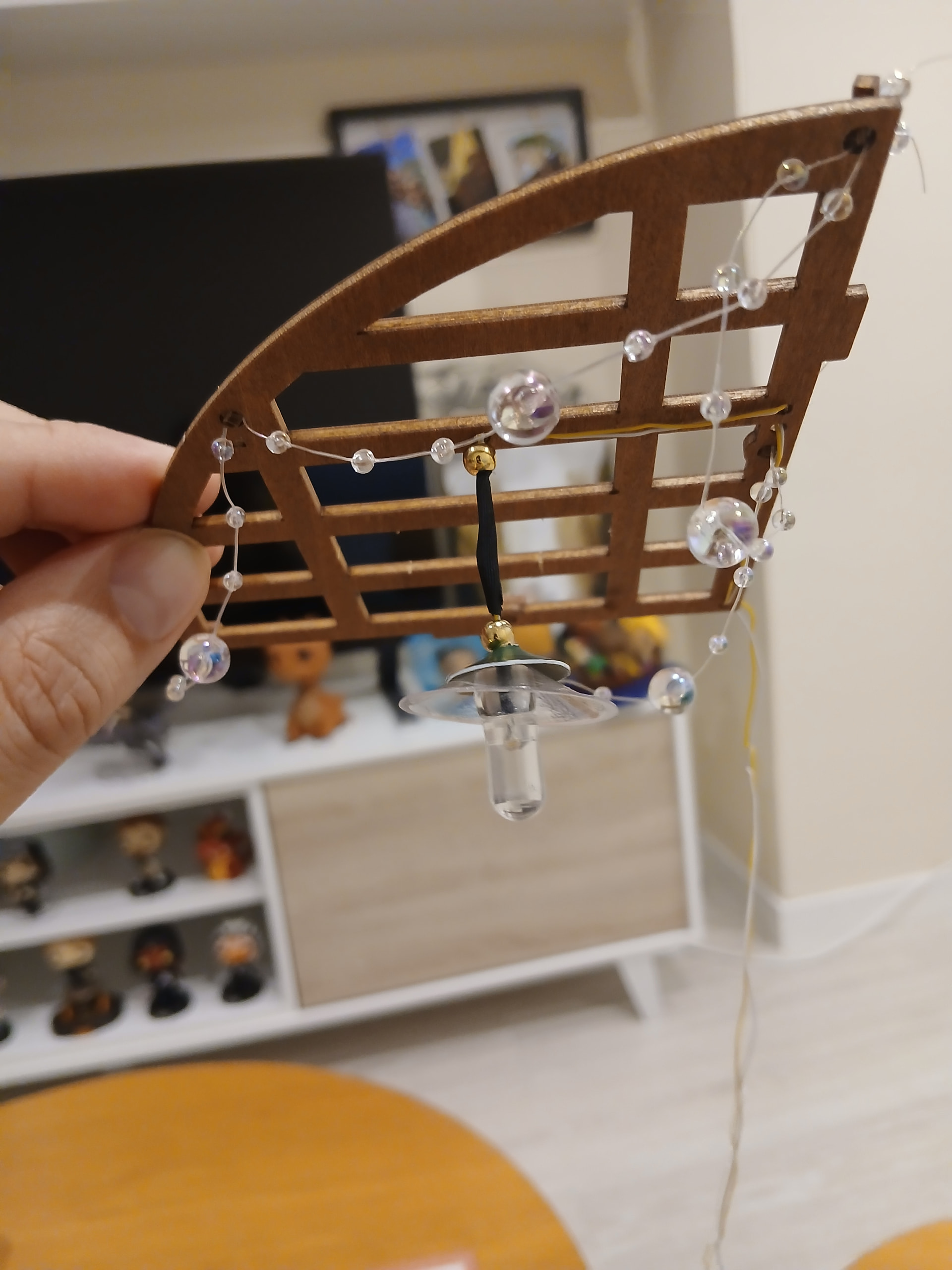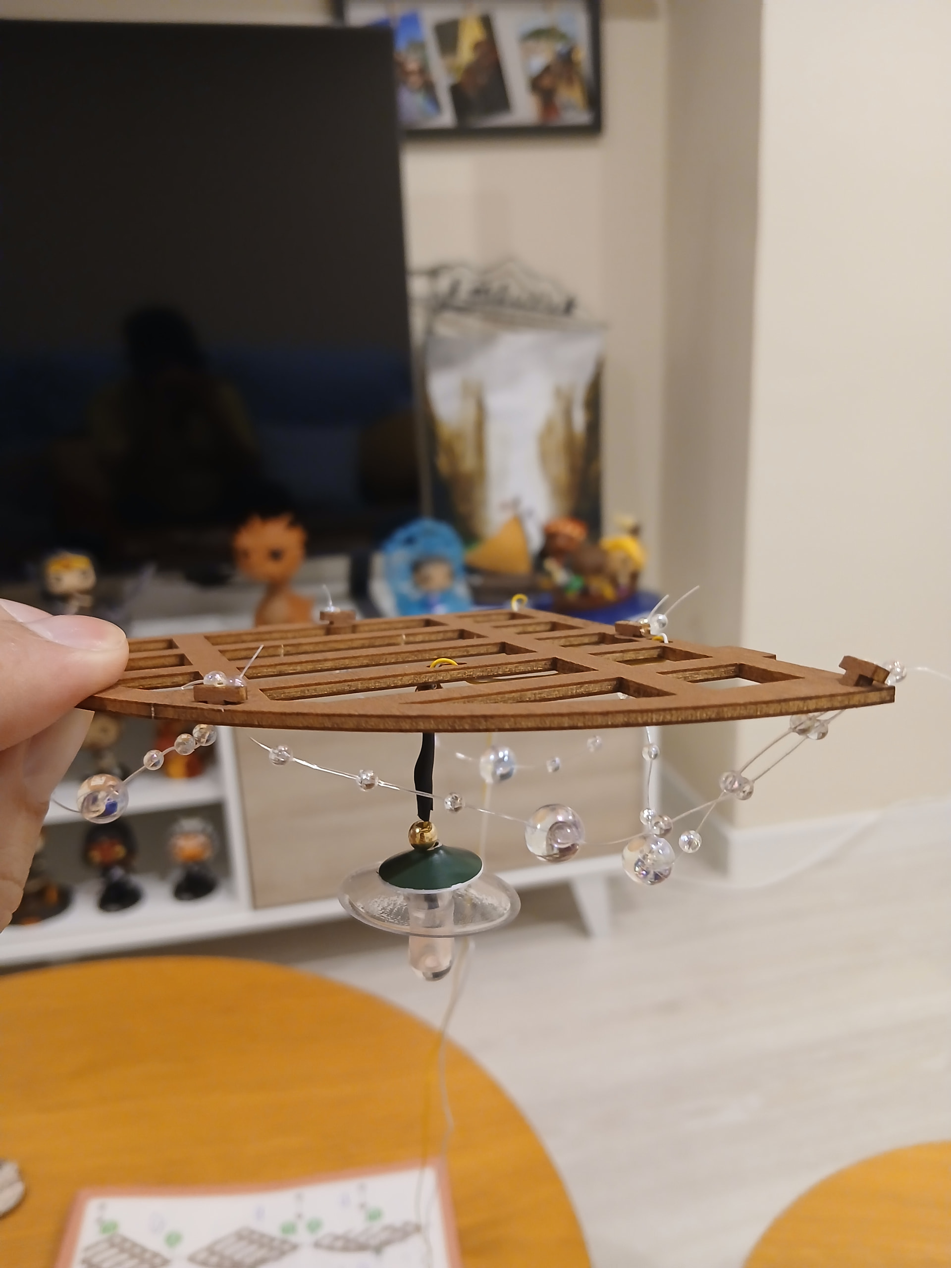 Oh. There was another thing I needed to add to the ceiling, and that was some decoration in the shape of some strings with shiny balls. It was a straightforward process of placing those strings through some holes and blocking them there with tiny wooden parts. The result is not that bad!