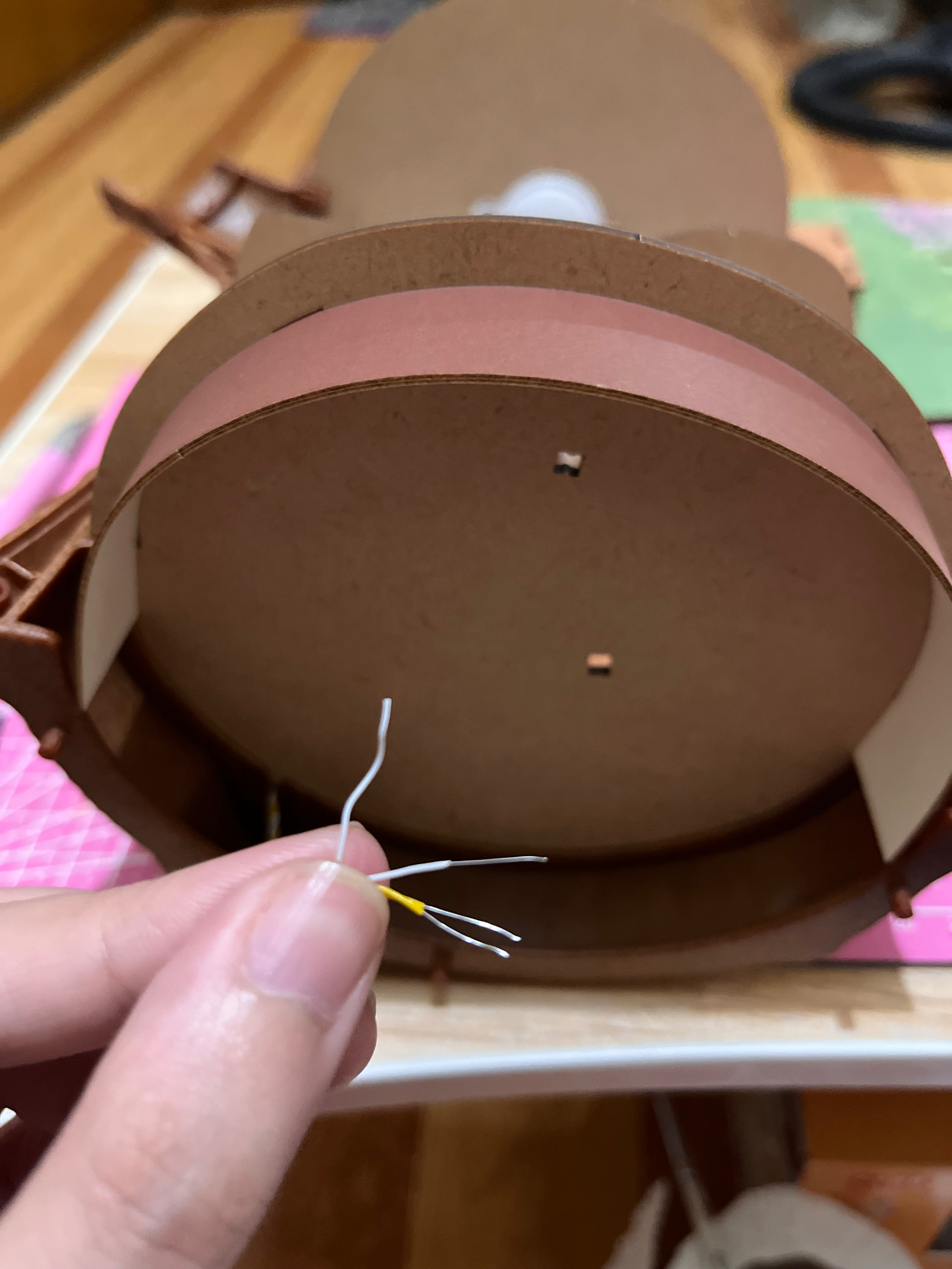 This is what it looks like before I put the wallpaper of the tree house. I’ve aligned the two pairs of wires: one is for 2F and the other one is for the lights of ground floor. I’ve used the double sided tape to align the wires.