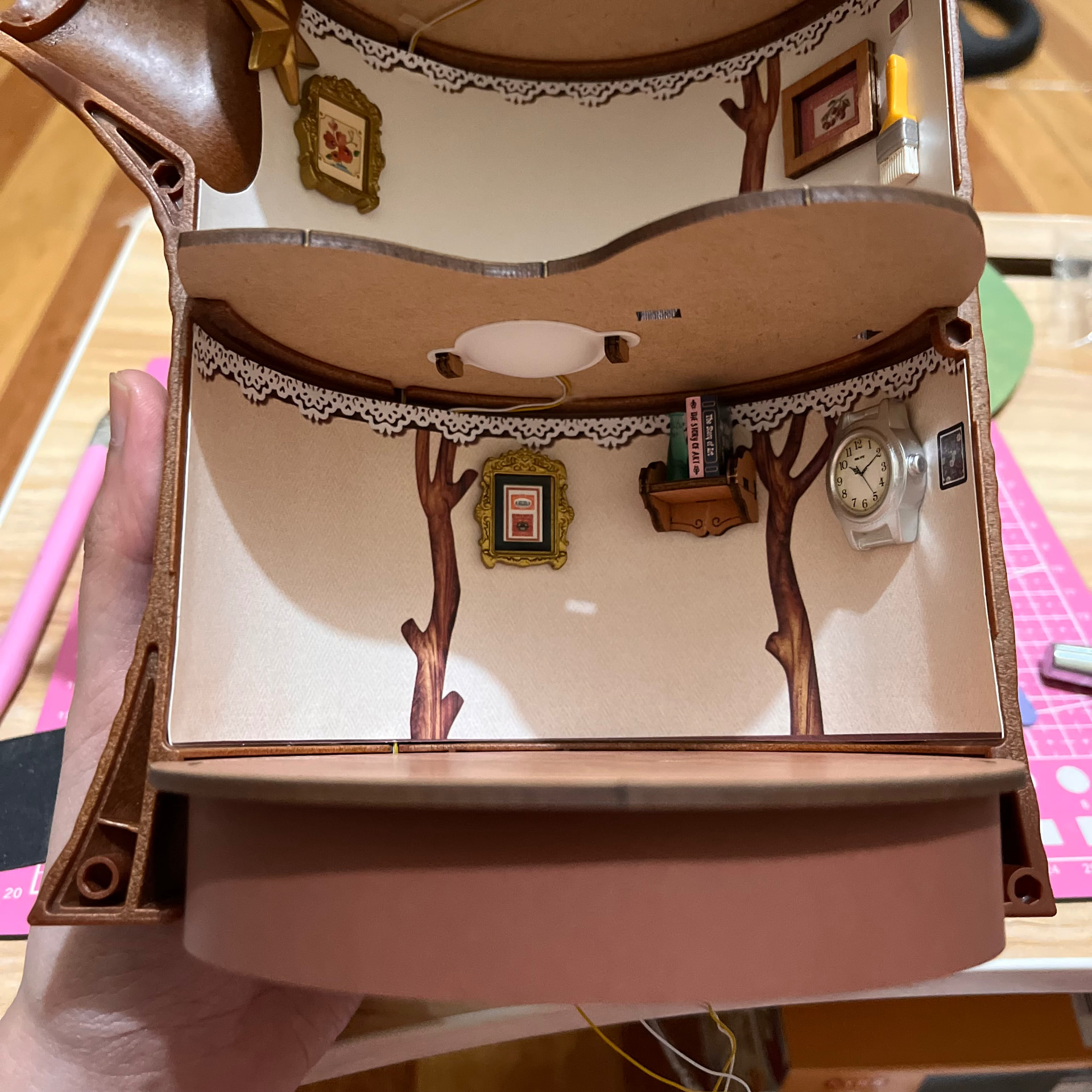 I’ve glued the wallpapers of the tree house and hang the items as per the instructions manual for the 1F and 2F. I carefully bend the wood at bottom of the floor as it is prone to damage.