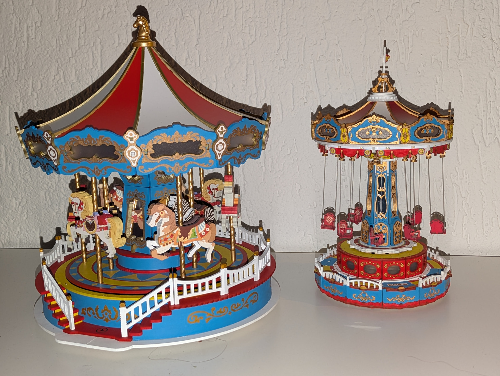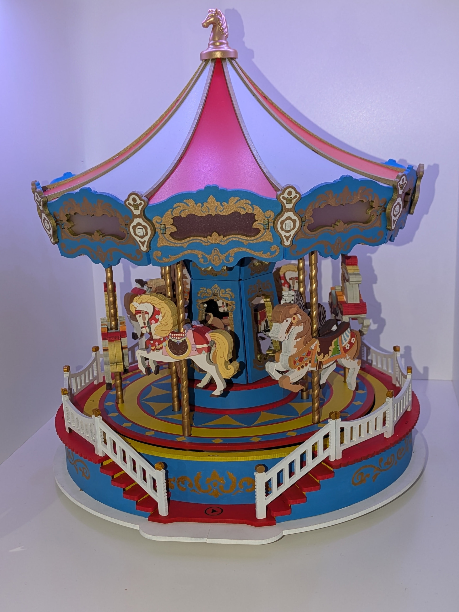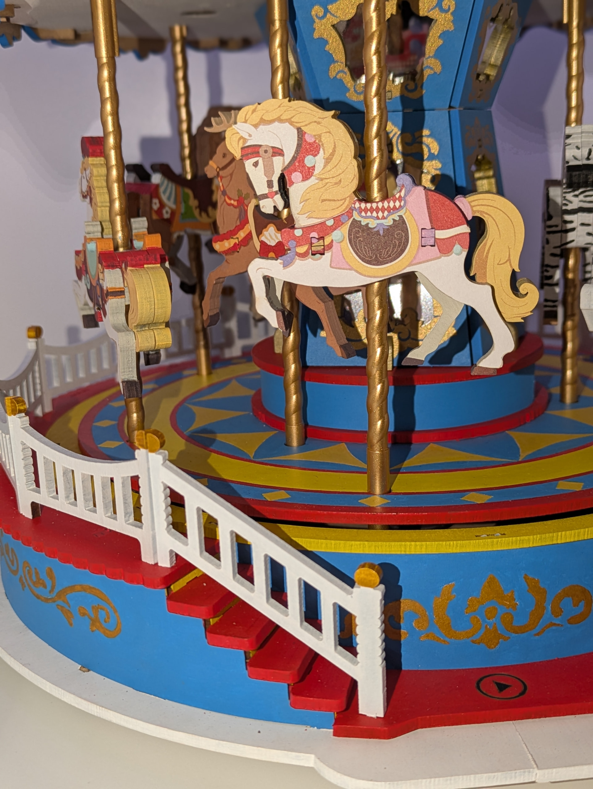 After a month of building and painting, the Classic Carousel is finally finished. I expected the fence would take longer, with all the edges needing to be painted. In the end, it went very quickly, thanks to the markers. Edges are much quicker to paint with good acrylic markers.