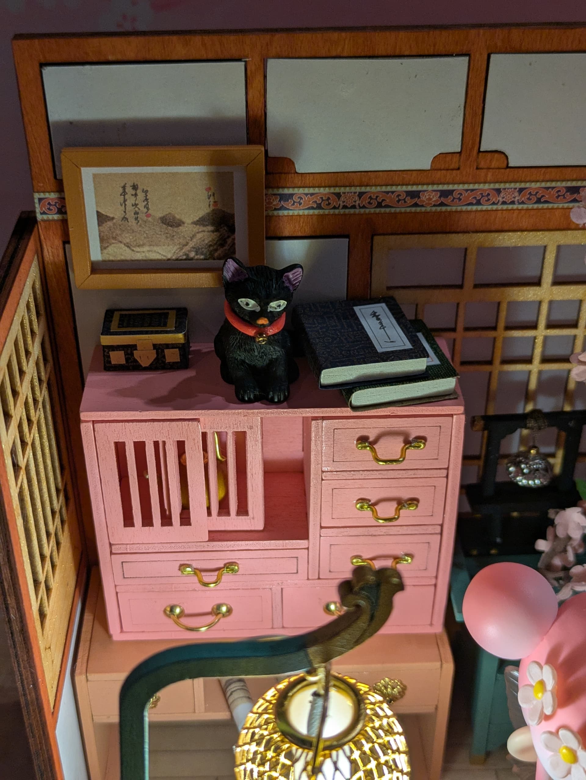 My first miniature house is finished. It was fun to make a different kind of building. I found the sakura tree dreadful to make, but I kept working and gluing, and before I knew it, it was finished. Secretly, I’m quite proud of the result. Nanci looks perfect in the building.