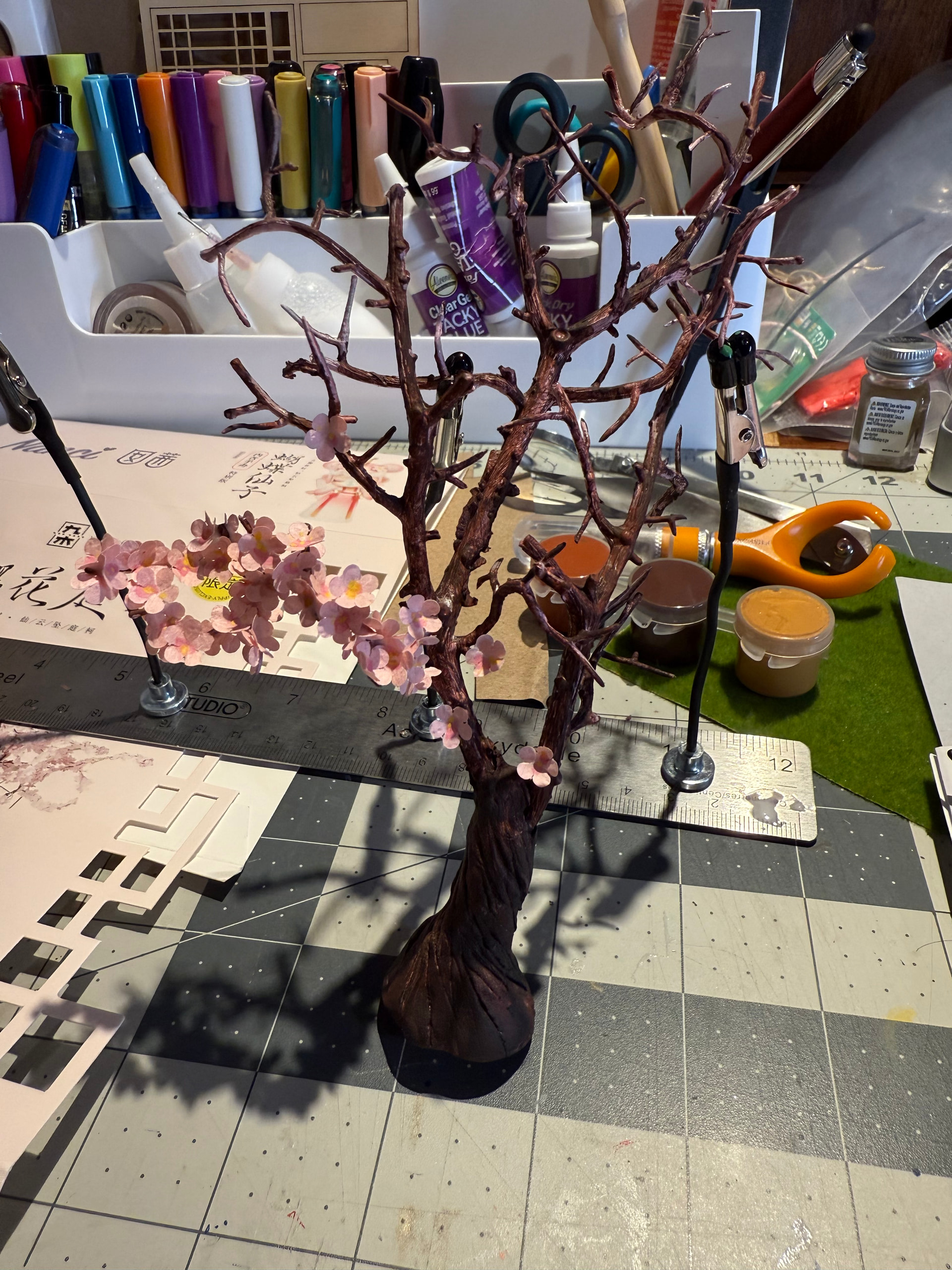 I find the tree is chipping brown colours so I painted it with a pink base using Tamiya spray paint, this helped the acrylic paint stick better. I layered dark and light brown. I finished it with shading using a black acrylic pen and added highlights with a light brown acrylic pen ![]()