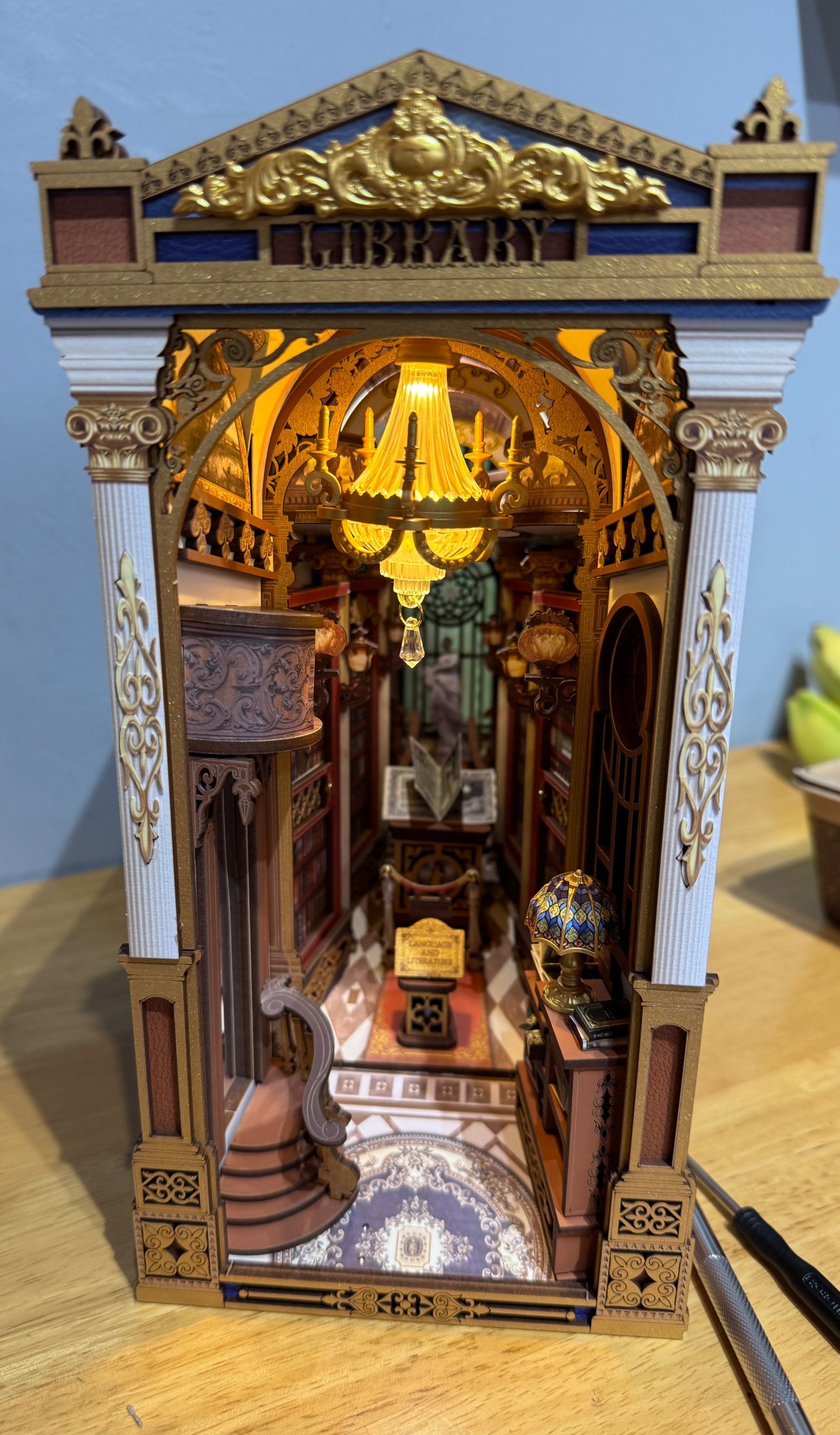 The lamp and chandelier gives this book nook a very nice highlight. It would belovely for any book nook to have dust cover.