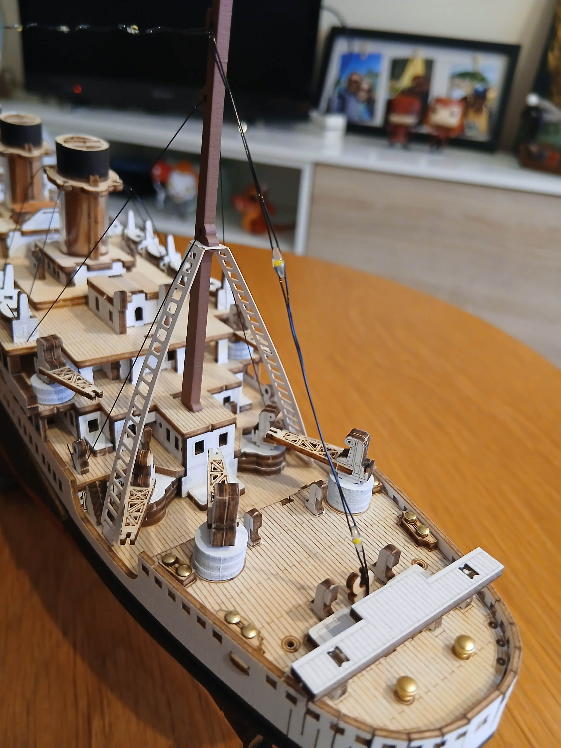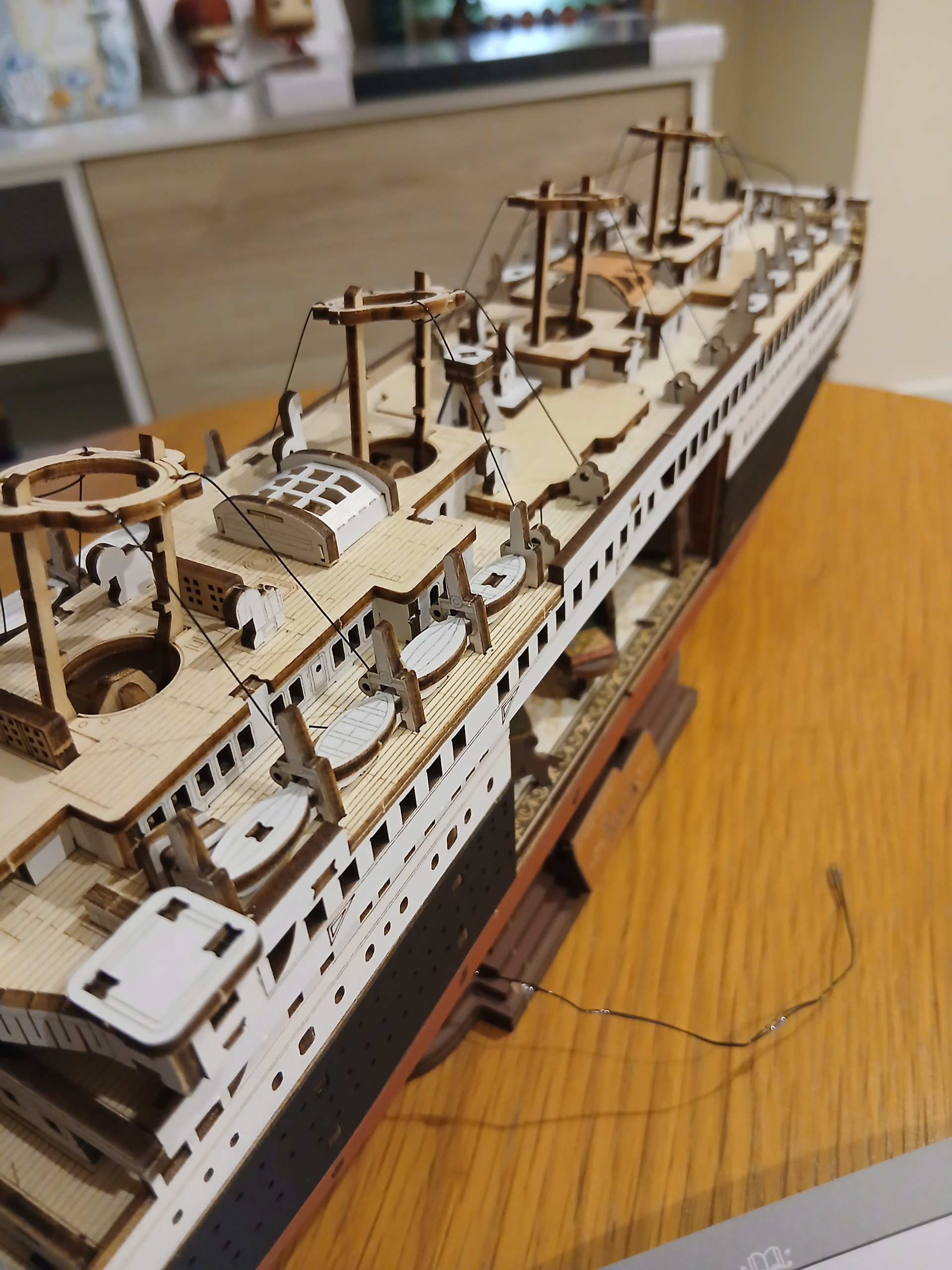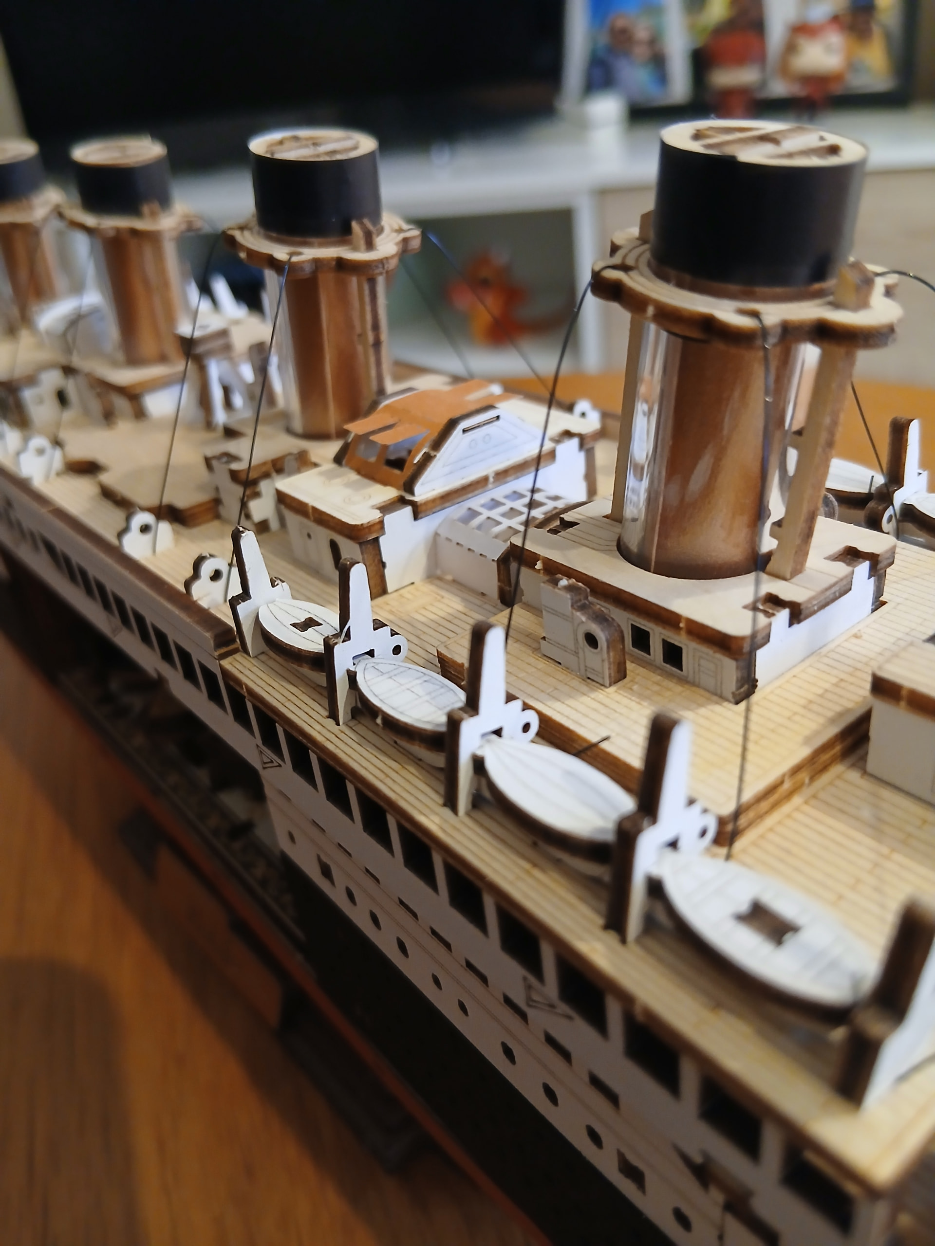 After most of those details were put together (I truly love how the Titanic was looking this far, everything was truly coming together! I was so, so, so happy about it), it was finally time to use the long roll of thin black rope that came with the kit. The purpose of that rope is to hold together the structures for the chimneys. It was a bit tricky but, honestly, once you’re putting two or three of them together and you get the point of them, the rest of them (you’re attaching four of them on each side of the deck) are pretty straightforward to deal with.