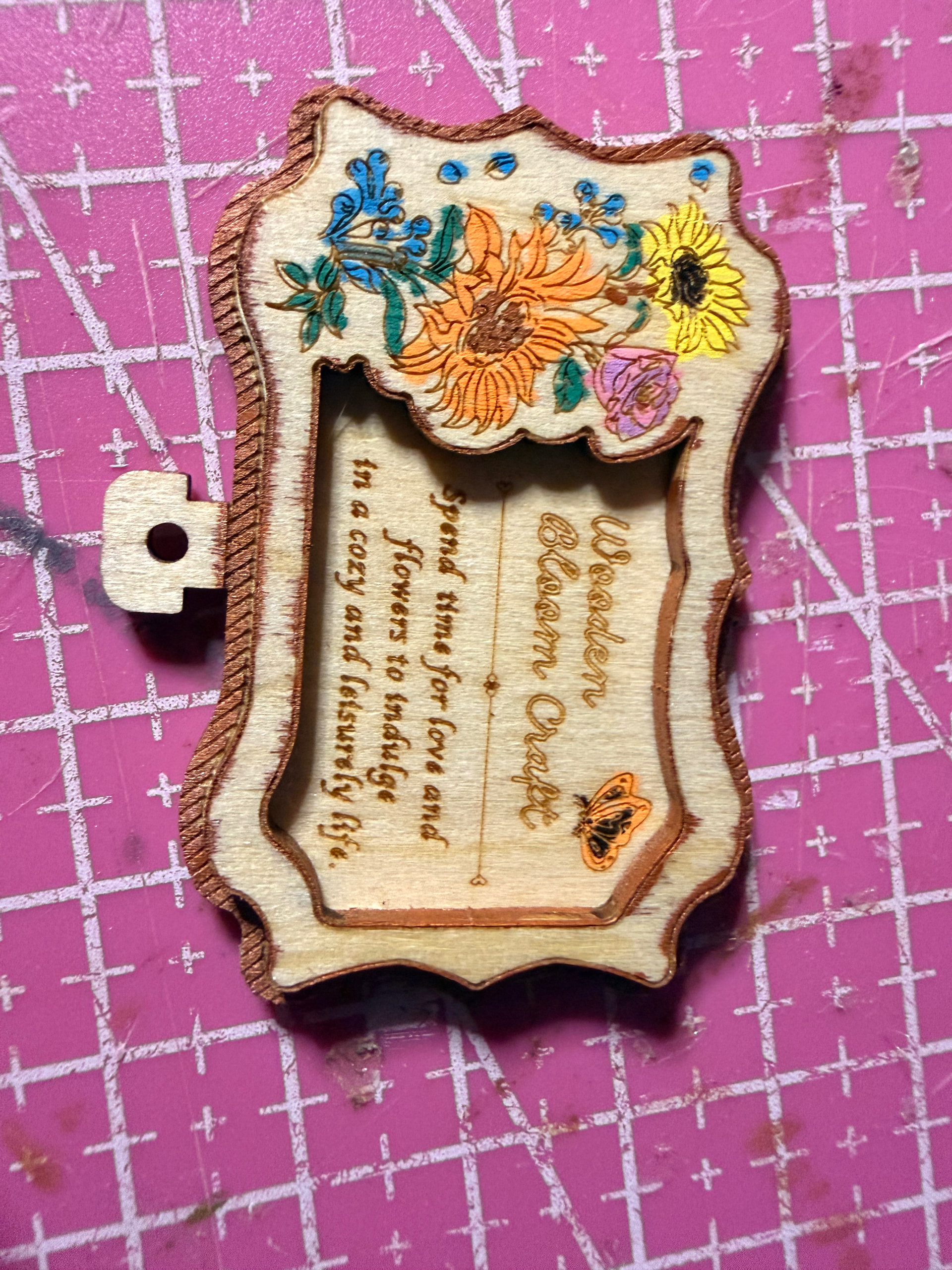 It took a little time because I did a lot of painting of edges, painting of plain wood, and colouring in. Bit upset that the colour bled on the edging of the gift tag, but it’s not noticeable unless you look really closely.