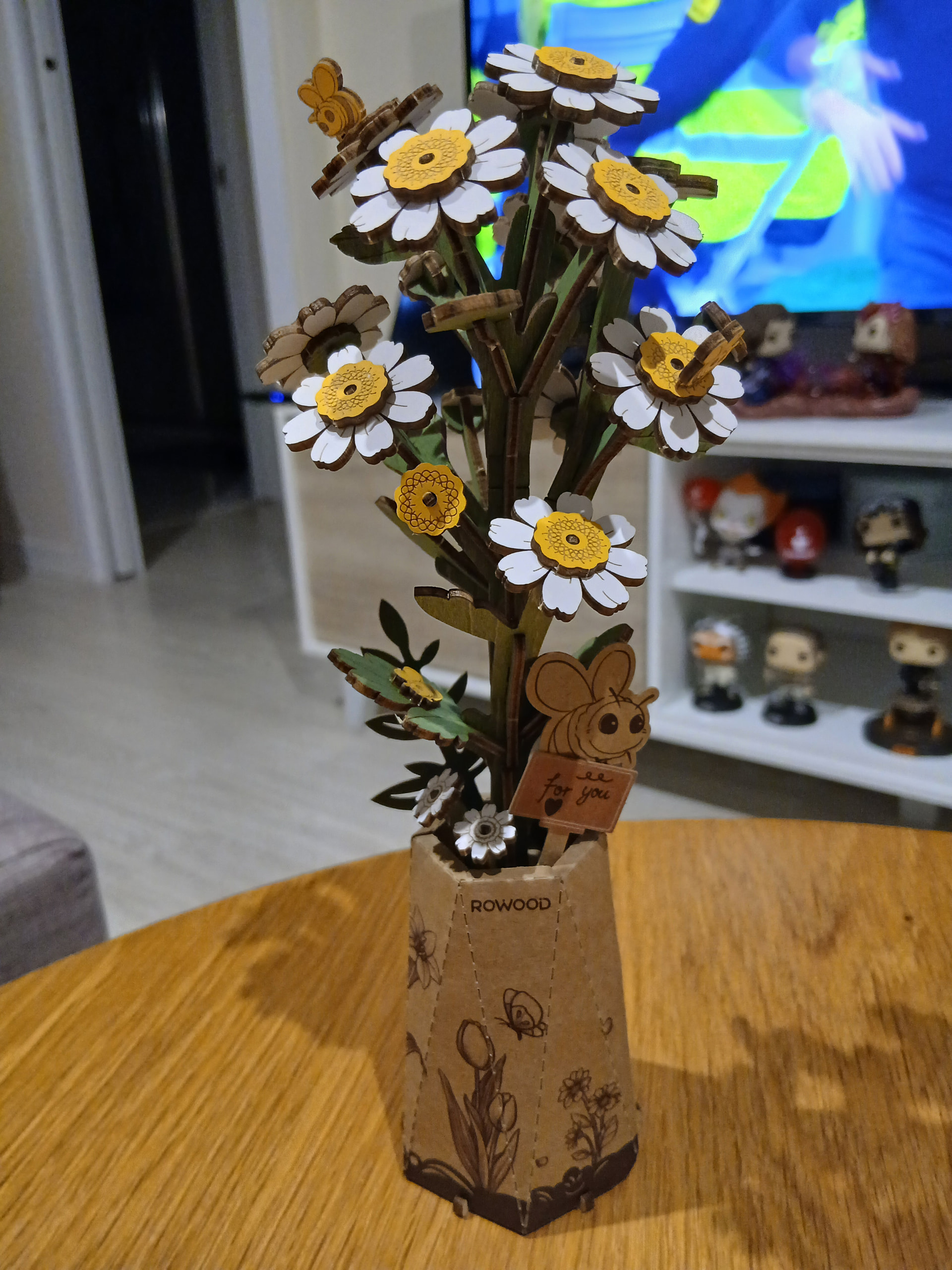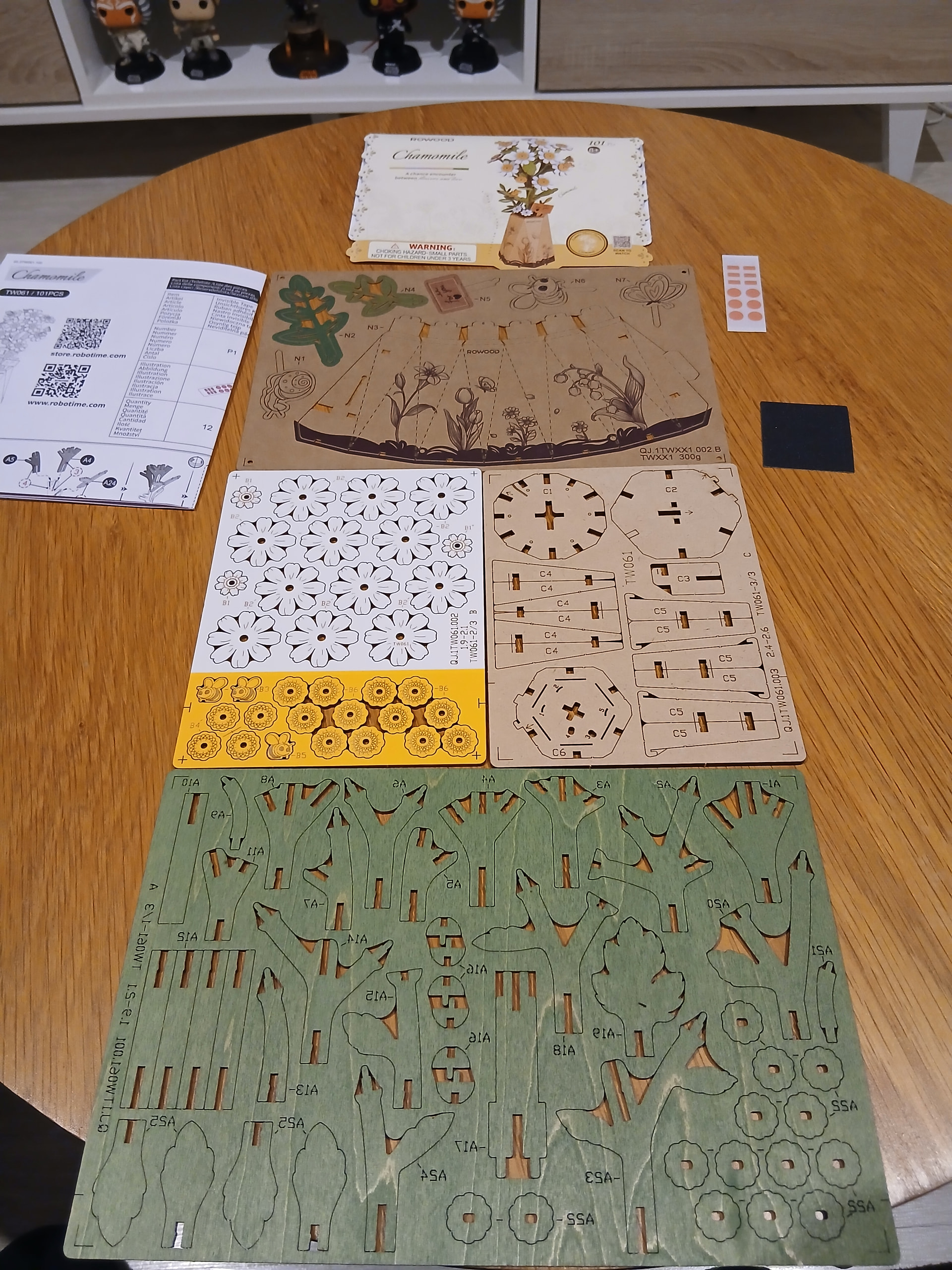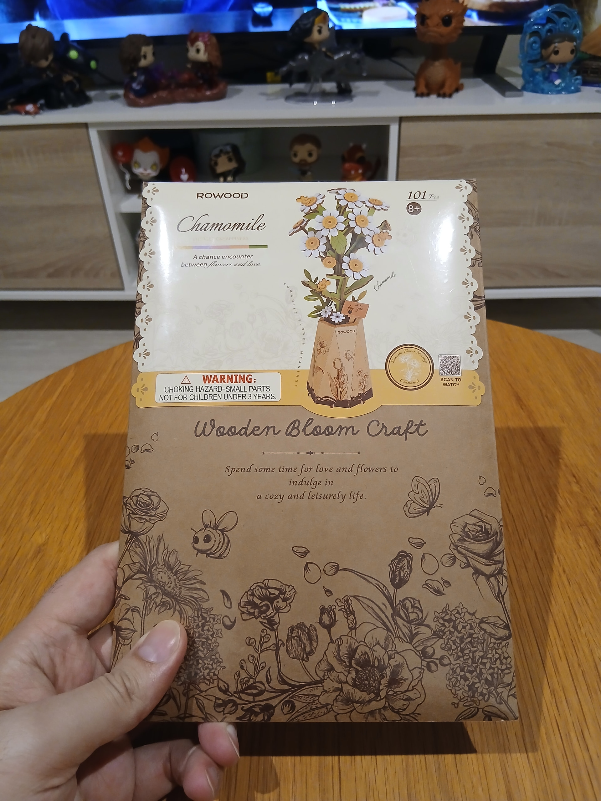 Well! Today I was supposed to keep going a bit with my Cheers Bar & Dining Miniature House, but… What can I say? It’s February 14th! Flowers, flowers everywhere. But while I don’t like the mini plant-crafting from other kits, I was curious about trying one of those Rowood wooden bloom crafts. The Chamomiles one was related to love, and it was cheap, so… Since for I guess obvious reasons anything looking like a rose or having red/pink-like colors was sold out, so I just bought this one and decided to made it before the end of the day. After all, while I’m loving the Miniature House, I still miss my beloved wooden puzzles ![]()