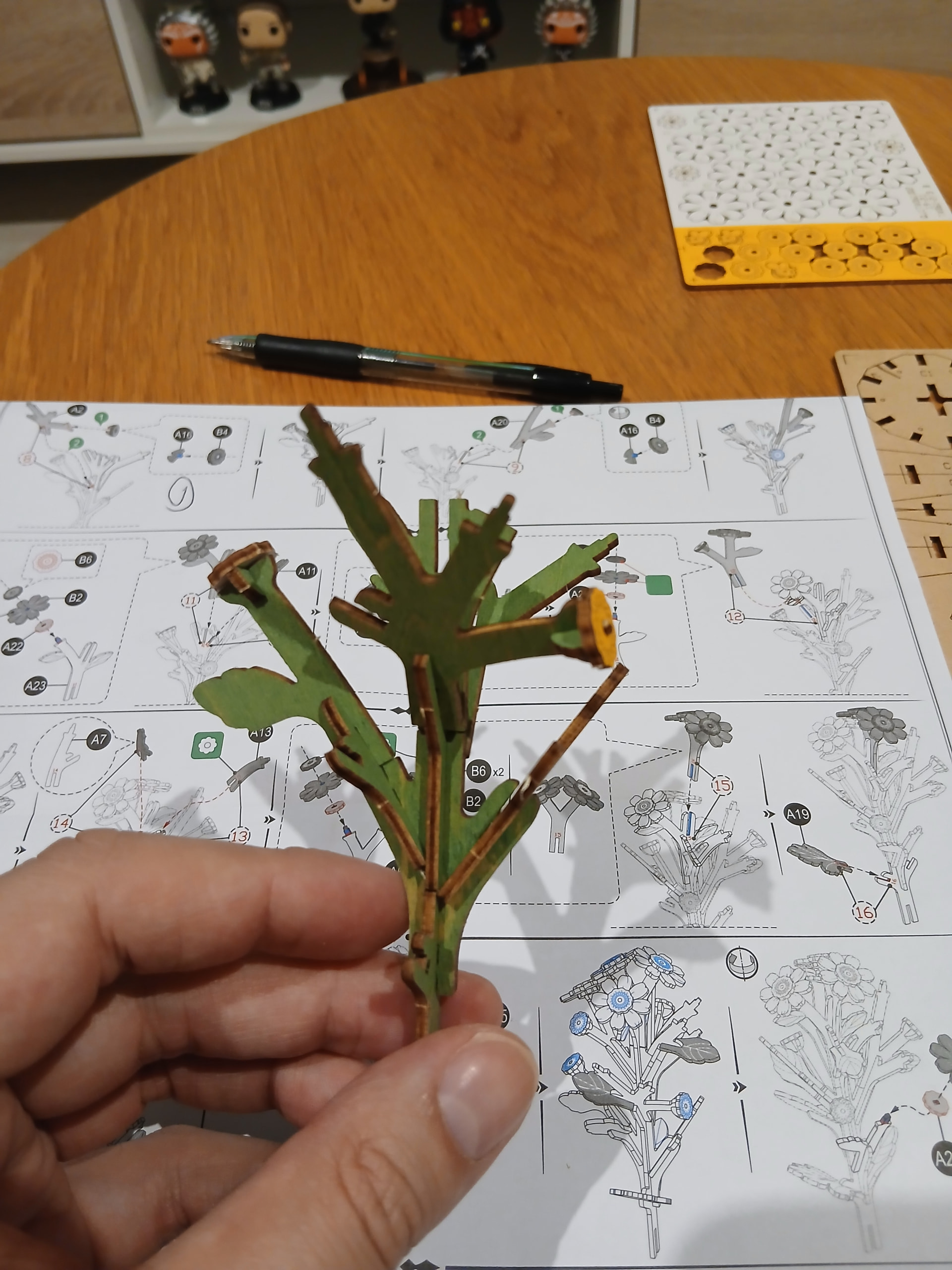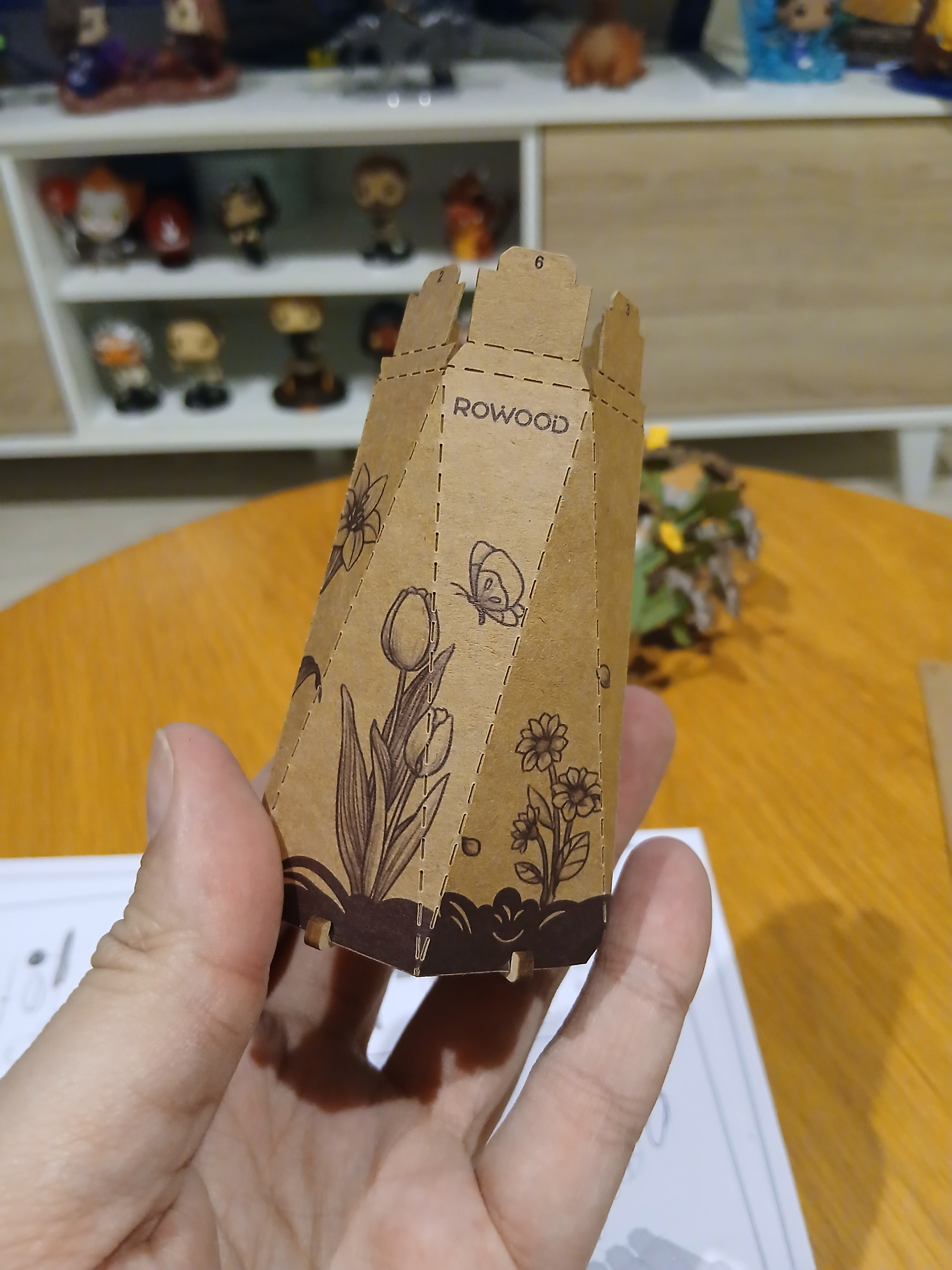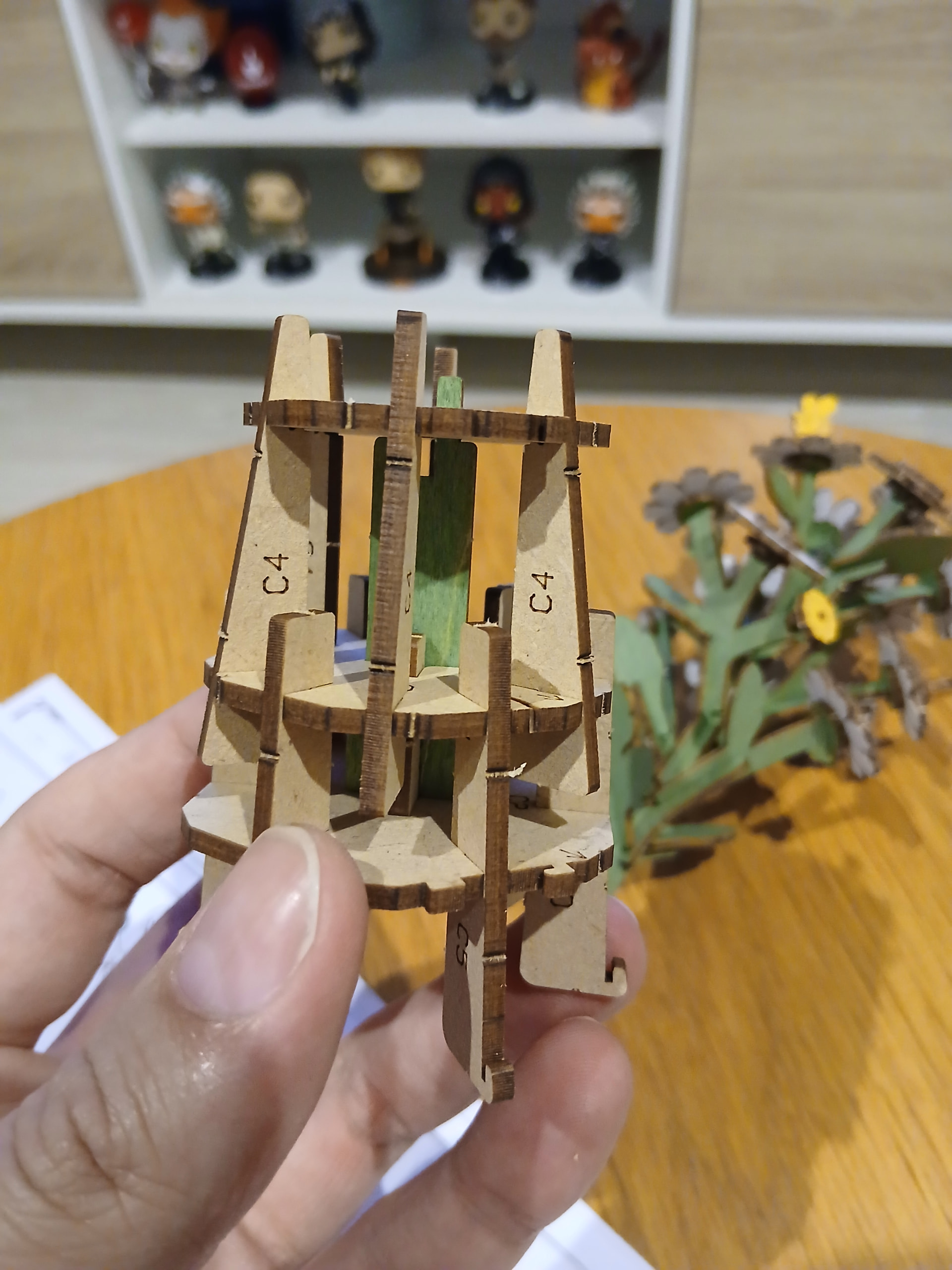 Well! Today I was supposed to keep going a bit with my Cheers Bar & Dining Miniature House, but… What can I say? It’s February 14th! Flowers, flowers everywhere. But while I don’t like the mini plant-crafting from other kits, I was curious about trying one of those Rowood wooden bloom crafts. The Chamomiles one was related to love, and it was cheap, so… Since for I guess obvious reasons anything looking like a rose or having red/pink-like colors was sold out, so I just bought this one and decided to made it before the end of the day. After all, while I’m loving the Miniature House, I still miss my beloved wooden puzzles ![]()