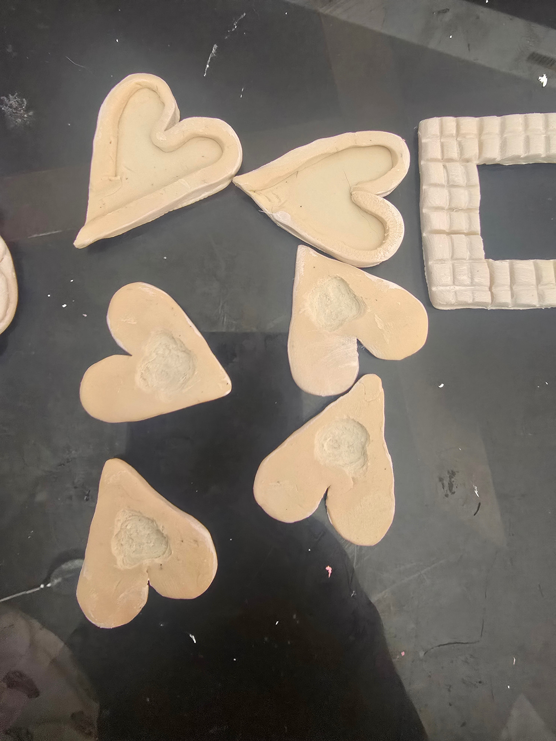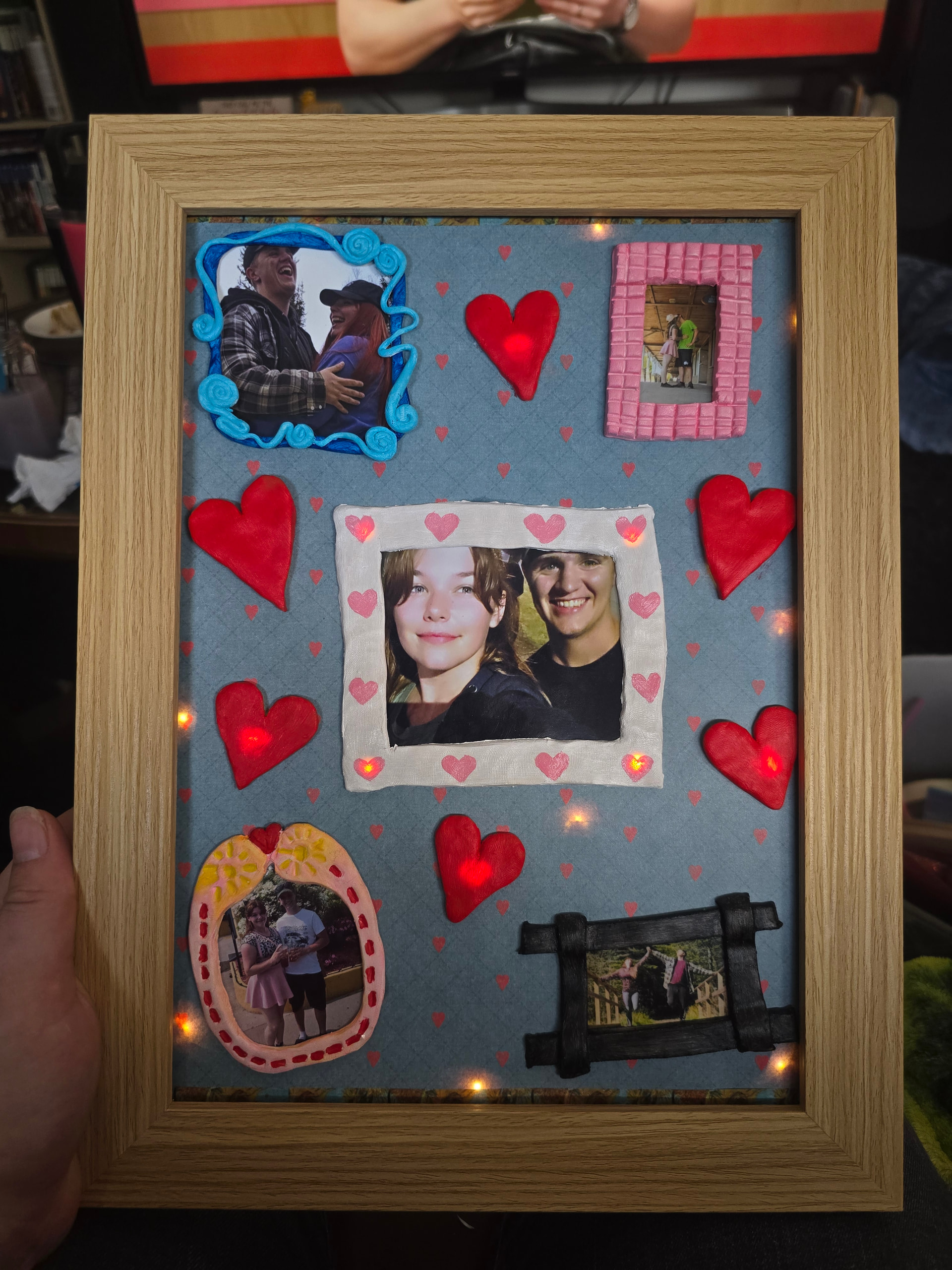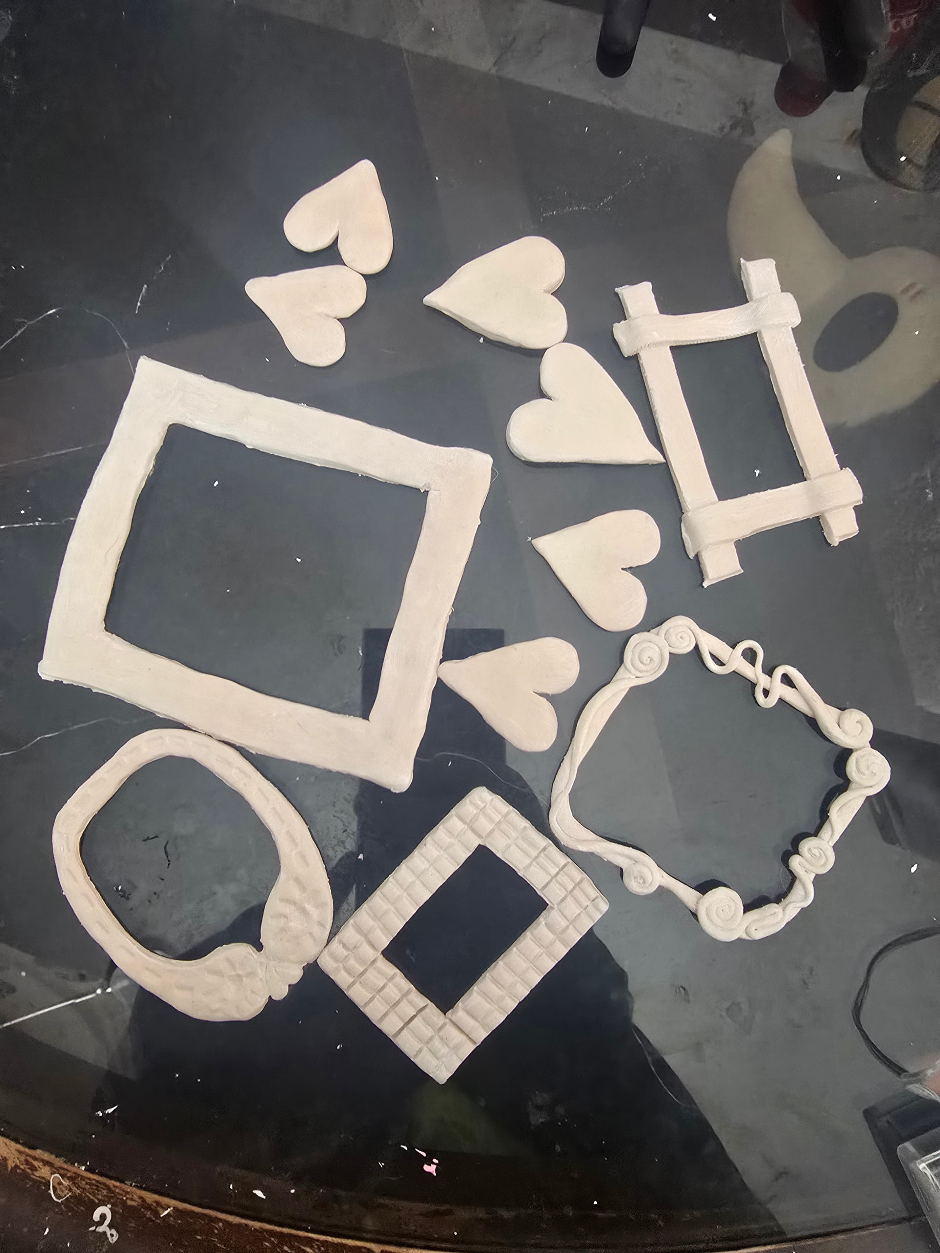 Here’s all the frames and hearts I made oit of oven clay! 4 of the hearts have holes in the back and the other 2 are spotlight hearts. I’ll show a photo here!