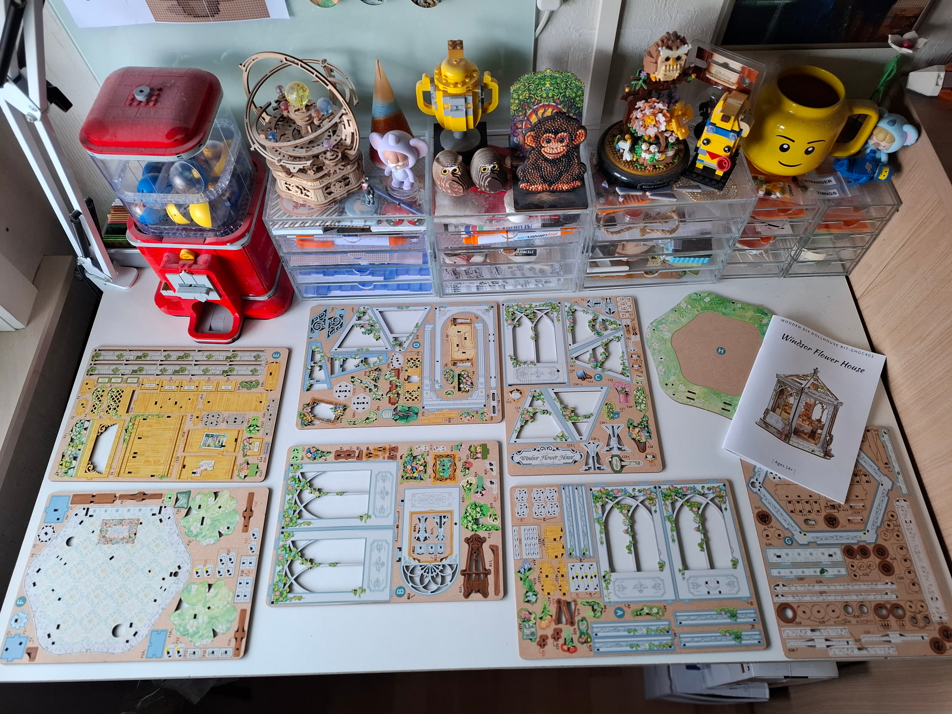The decision has been made, I will TRY and do the Windsor Flower House as my next build, sorry it is not Rokr/Robotime/Rolife/Rowood this time and this is another brand, I’m a bit nervous about it to be honest, because it is a combined wooden kit with plastic and paper and fabric, but by now I know I can get advice from my husband with this kind of build because he already did kits like this, so I will try and keep you all up to date on the progress, there are batteries included in the kit, so I guess that there maybe be lights or something else happening in there, you can choose the final layout in it, putting in the couple or another figure (funny that other figure is a person taking care of the flowers, so husband said this is you the Flower Lady), maybe I just put in both somehow